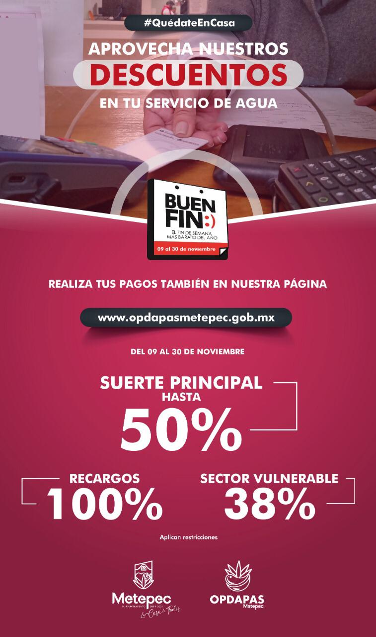Metepec, México, 15 de noviembre de 2020. A través del Organismo Público Descentralizado de Agua Potable, Alcantarillado y Saneamiento de Metepec (OPDAPAS), el ayuntamiento ofrece descuentos del 50 por ciento en la suerte principal por derechos de agua, 100 por ciento en recargos y 38 por ciento para el sector vulnerable, mientras que por concepto de predial, el descuento en multas y recargos es del 100 por ciento.