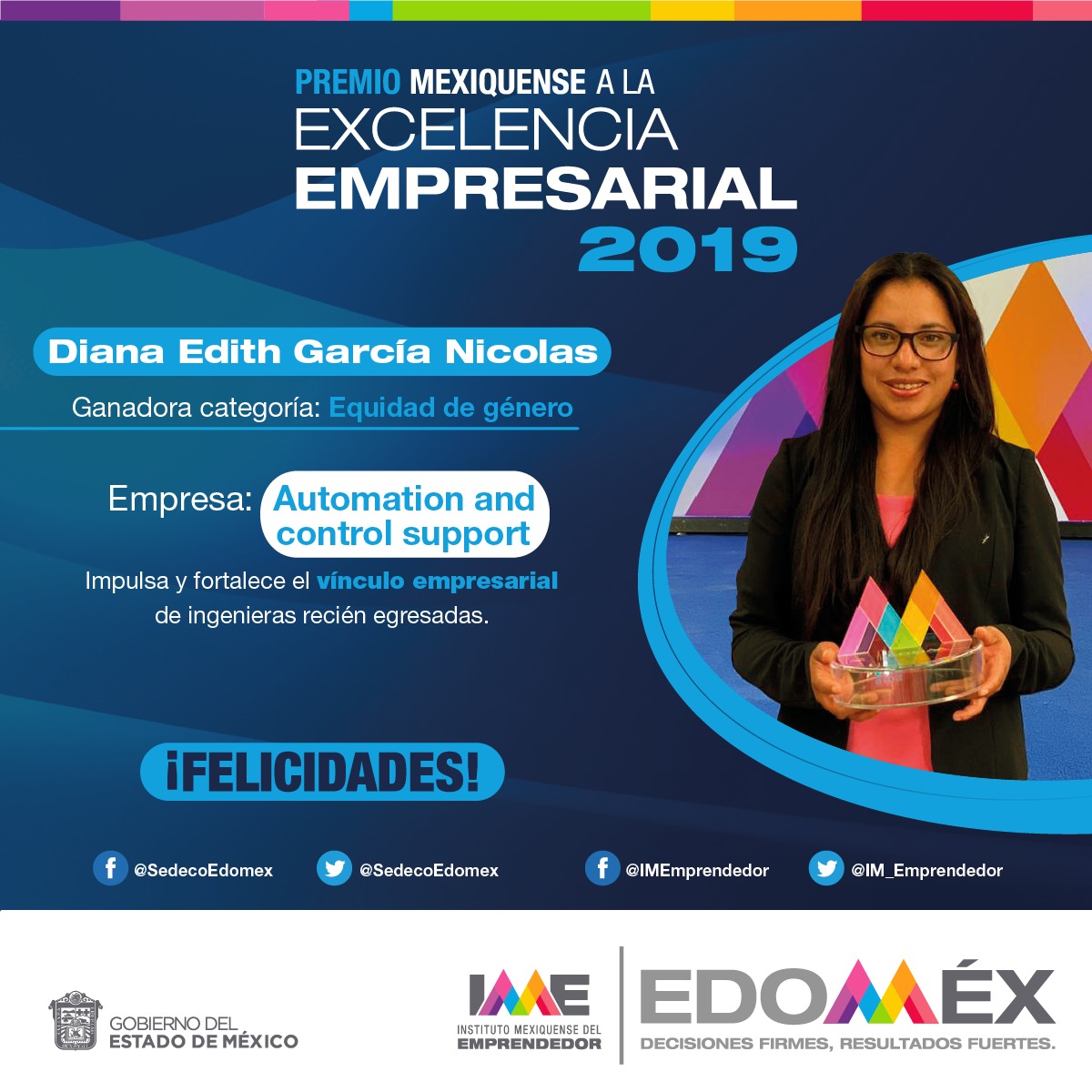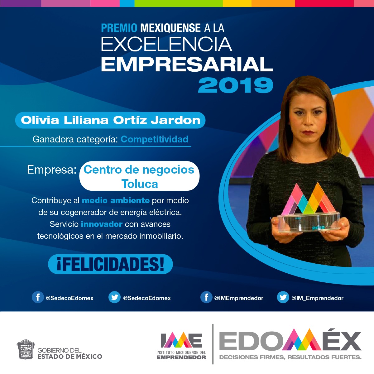 Cabe indicar que dichos ganadores obtuvieron un reconocimiento y 50 mil pesos, la promoción en los programas de Gobierno del Estado de México y del Consejo Estatal de Fomento Económico y Competitividad, asistencia técnica para fortalecer su gestión estratégica, operativa, tecnológica, comercial o técnica para su crecimiento.