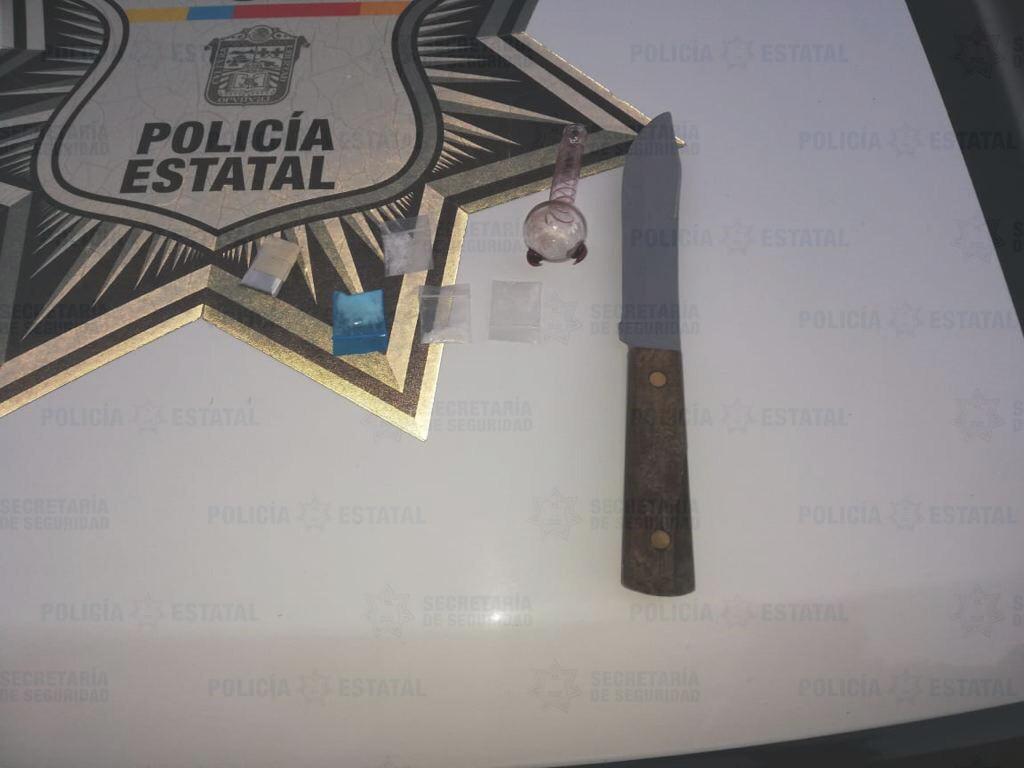 Tras su detención, Luis Ángel “N” de 18 años de edad, Heriberto “N” de 22 y una adolescente de 16 años fueron sometidos a una revisión protocolaria, donde se les aseguró un arma blanca y dosis de posible droga.
