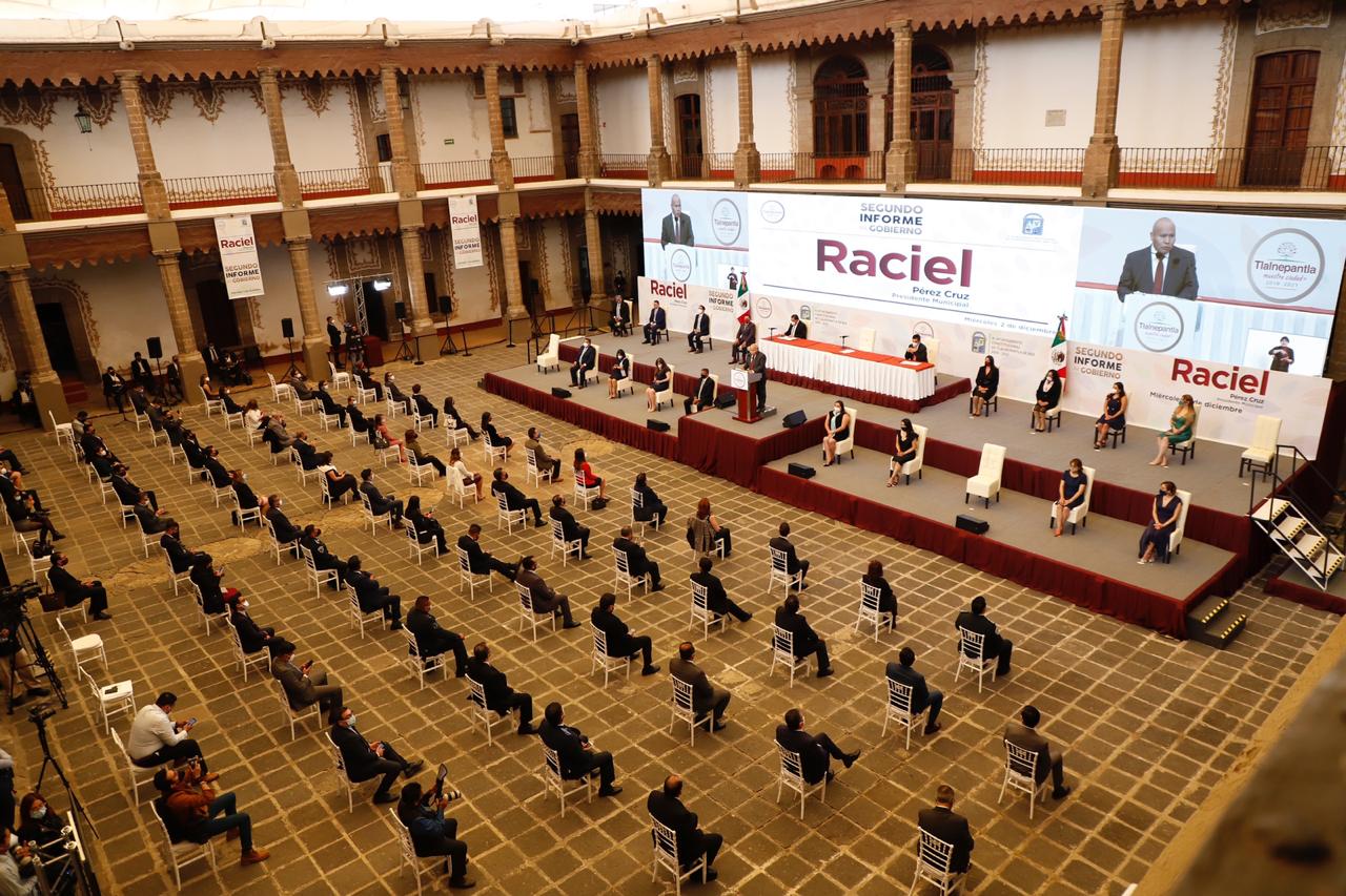 El Presidente Municipal Raciel Pérez Cruz presentó su Segundo Informe de Gobierno, detalló las acciones implementadas para transformar a Tlalnepantla en una ciudad segura, sustentable e incluyente, con una administración transparente que combate la corrupción, la violencia de género, apoya la cultura y la educación, además de las medidas que se realizan para enfrentar la pandemia de COVID-19.