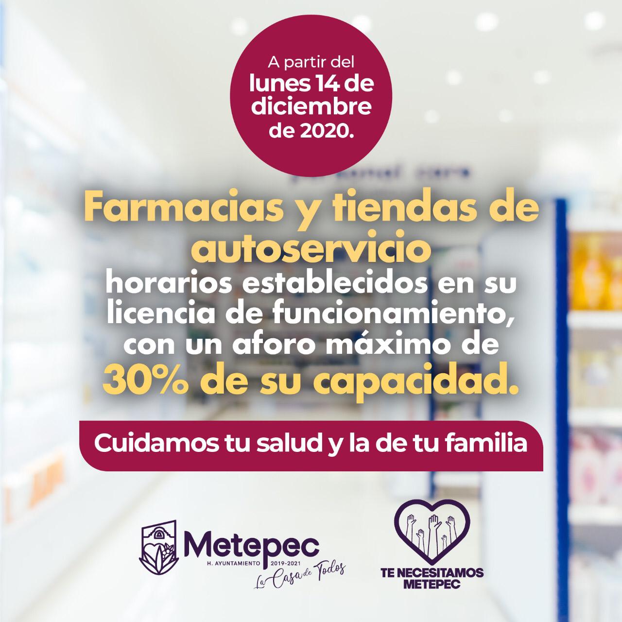 Las tiendas de autoservicio, de conveniencia y análogas, al igual que las farmacias, seguirán operando en horario normal, respetando las medidas de sana distancia, uso de cubrebocas, aplicación de gel antibacterial, toma de temperatura, utilización de tapetes sanitizantes y aforo no mayor al 30 por ciento de la capacidad.