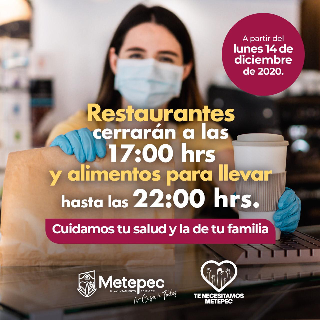Metepec, México; 11 de diciembre de 2020. La alcaldesa de Metepec, Gaby Gamboa Sánchez, informó que a partir del próximo lunes 14 de diciembre y hasta que disminuya el índice de contagio, se adecuarán horarios para el funcionamiento de establecimientos comerciales, a fin de evitar transmisión por el virus SARS CoV-2 que ha tenido un incremento sustancial en los últimos días en toda la entidad.