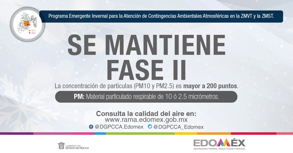 Metepec, Estado de México, 1 de enero de 2021. La Secretaría del Medio Ambiente del Gobierno del Estado de México (SMA), a través de la Dirección General de Prevención y Control de la Contaminación Atmosférica (DGPCCA), informa que se mantienen las acciones de la Fase II de Contingencia Ambiental Atmosférica en las Zonas Metropolitanas del Valle de Toluca y Santiago Tianguistenco.
