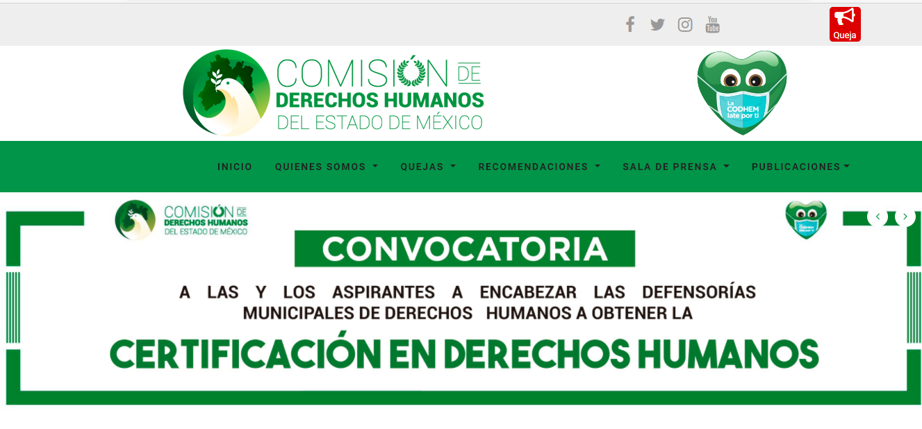 Toluca, Estado de México, 21 de enero de 2021.- La Comisión de Derechos Humanos del Estado de México (Codhem) emitió la convocatoria para que las y los aspirantes a encabezar las Defensorías Municipales de Derechos Humanos, se capaciten y obtengan la correspondiente certificación sobre los conocimientos y las herramientas necesarias para desarrollar su tarea de forma ética, profesional y eficiente.