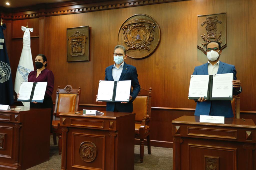 Ante los secretarios generales de la FAAPAUAEM, Gilda González Villaseñor, y SUTESUAEM, Pedro Rodríguez Magallanes, el rector agradeció la capacidad para dialogar de los representantes sindicales que intervinieron en esta negociación y la compresión de las condiciones por las cuales transita el mundo a consecuencia de la pandemia.
