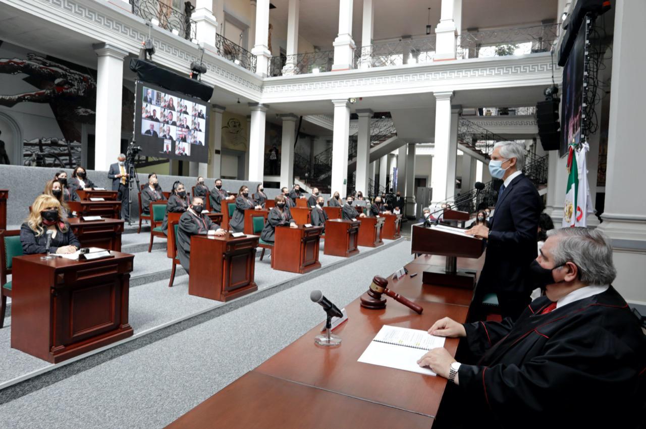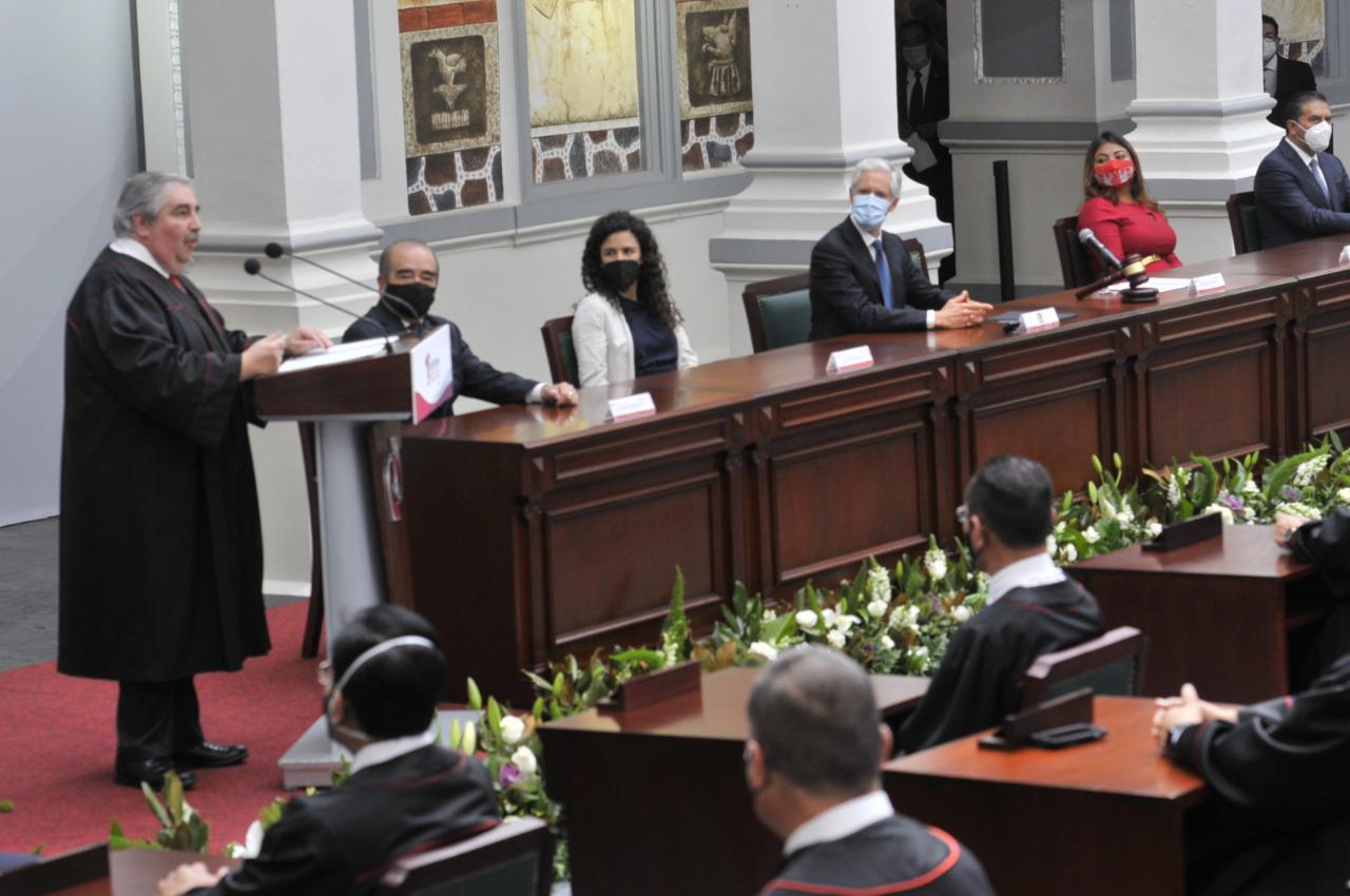 En presencia de Luisa María Alcalde Luján, Secretaria del Trabajo y Previsión Social del Gobierno de México, Del Mazo Maza apuntó que el 2020 será recordado como un año de desafíos, en el que el Poder Judicial inició con un liderazgo renovado, una nueva etapa en su historia, y que ante los retos de la emergencia sanitaria ha logrado buenos resultados, producto de la adaptación de sus funciones a la nueva normalidad, que privilegia el trabajo y los trámites a distancia.