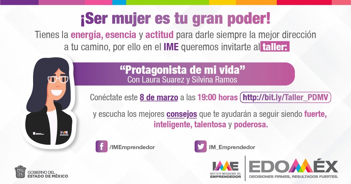 Toluca, Estado de México, 8 de marzo de 2021. Con el apoyo de expertas en emprendimiento, la Secretaría de Desarrollo Económico (Sedeco), en coordinación con el Instituto Mexiquense del Emprendedor (IME), conformó, en el marco del Día Internacional de la Mujer, el taller “Protagonista de mi vida”, orientado a fortalecer las habilidades e ideas de negocios de las mujeres mexiquenses.