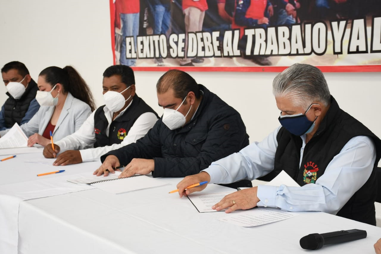 Huehuetoca, Estado de México, 9 de marzo de 2021. Herminio Cahue Calderón, Secretario General del Sindicato Único de Trabajadores de los Poderes, Municipios e Instituciones Descentralizadas del Estado de México (Suteym) y José Luis Castro Chimal, Presidente Municipal Constitucional de Huehuetoca, encabezaron la firma del convenio de sueldo y prestaciones del presente año.