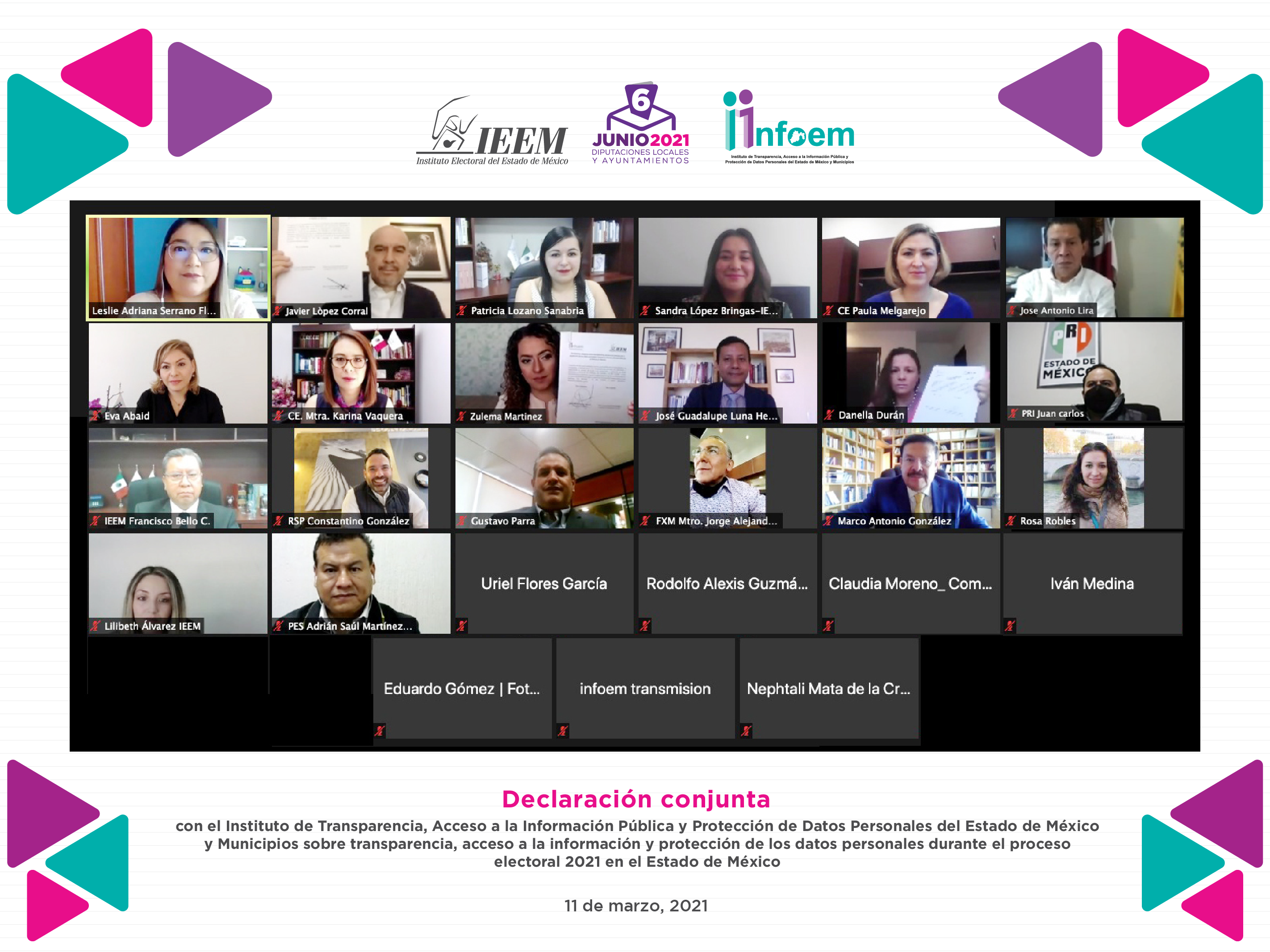 El Instituto Electoral del Estado de México (IEEM) y el Instituto de Transparencia, Acceso a la Información Pública y Protección de Datos Personales del Estado de México y Municipios (Infoem) firmaron una declaración conjunta sobre transparencia, acceso a la información y protección de los datos personales durante el Proceso Electoral 2021.
