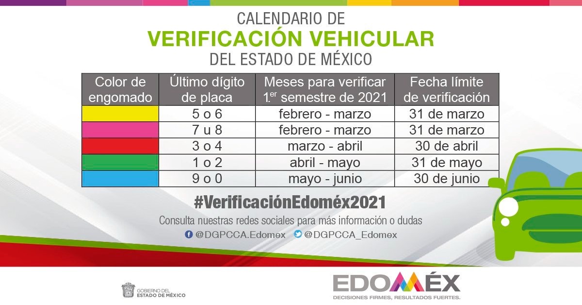 La DGPCCA pone a disposición de la ciudadanía la información del Programa de Verificación Vehicular Obligatoria para el primer semestre del año 2021 en https://sma.edomex.gob.mx/verificacion_vehicular, así como el correo electrónico atnpublico@smagem.net, los teléfonos 55-5366-8267 y 722-238-2268, y las redes sociales en Twitter @DGPCCA_Edomex y Facebook @DGPCCA.Edomex.