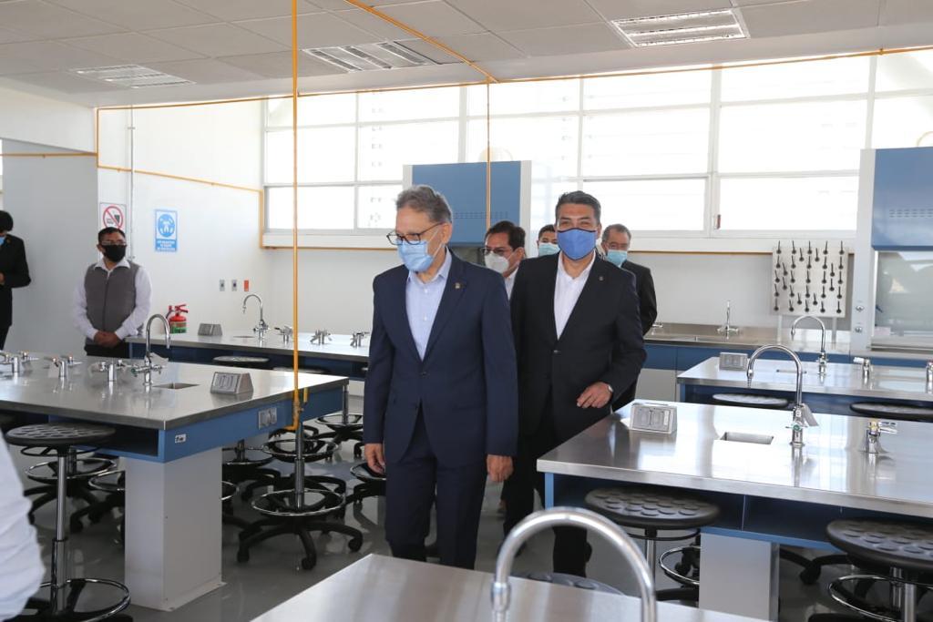 Después de inaugurar la torre de destilación del laboratorio de ingeniería química, Alfredo Barrera Baca entregó infraestructura académica y deportiva en beneficio de la comunidad auriverde del campus “El Cerrillo”, entre las que destacan, la rehabilitación de la “Casa de servicio social y prácticas profesionales” y el cuarto de herramientas de la Coordinación de producción de la Facultad de Medicina Veterinaria y Zootecnia.