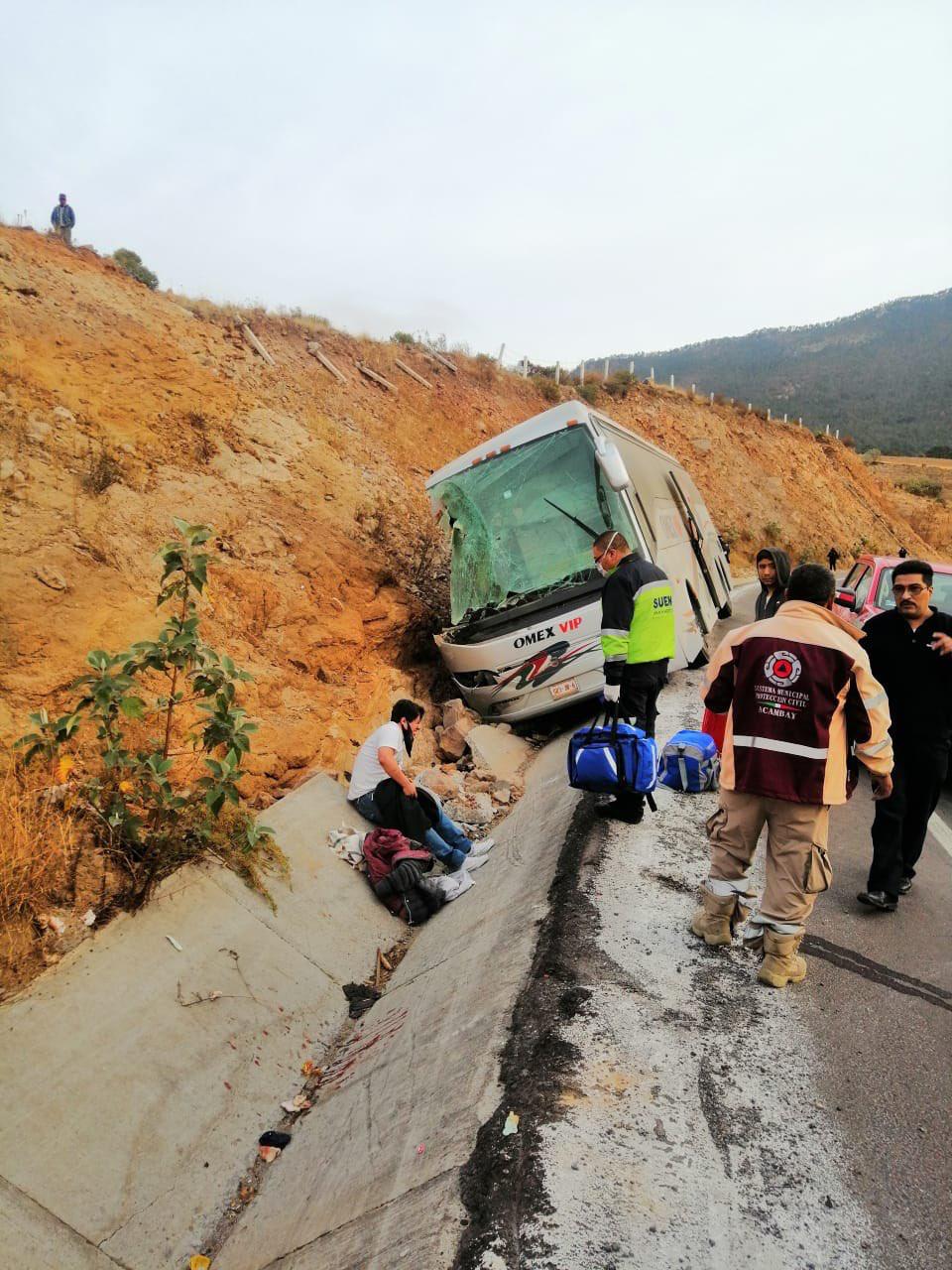 Los hechos ocurrieron alrededor de las seis de la mañana en el Libramiento a Acambay, donde a través de la frecuencia operativa, personal del SUEM fue alertado de que un camión de pasajeros, proveniente de Saltillo, Coahuila, con dirección a la capital mexiquense se había salido de la carretera.