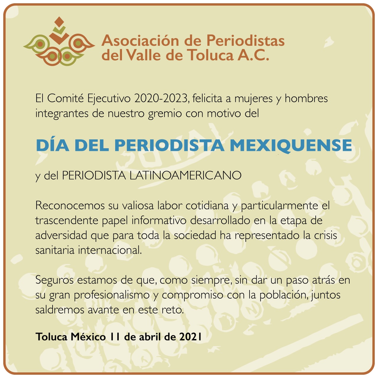 El Comité Ejecutivo 2020-2023, acompañado de varios integrantes de la agrupación, se dio cita en el obelisco ubicado en la Plaza del Periodista, en la capital mexiquense, donde a través del mensaje de su presidente, Sergio Villafuerte, hicieron una breve semblanza de la fecha y sus antecedentes, además de destacar el papel de los comunicadores en la crisis sanitaria causada por el Sars-CoV2, causante del Covid-19, que ha dejado numerosas víctimas.