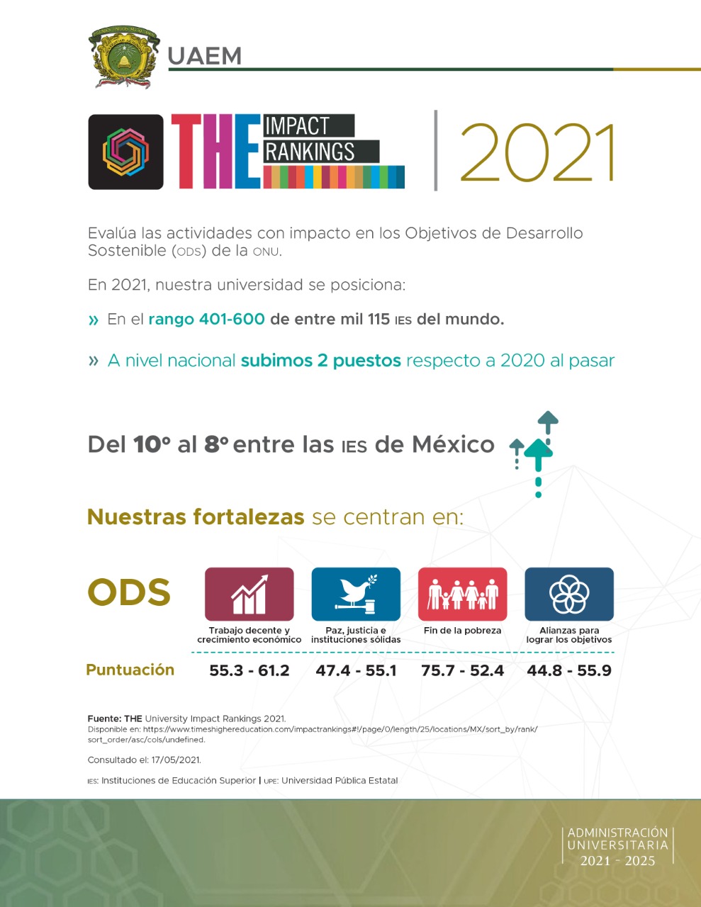 - La Autónoma mexiquense ocupa el octavo lugar entre las instituciones de educación superior públicas y privadas mexicanas, según el Ranking de Impacto Universitario 2021 del Times Higher Education (THE).