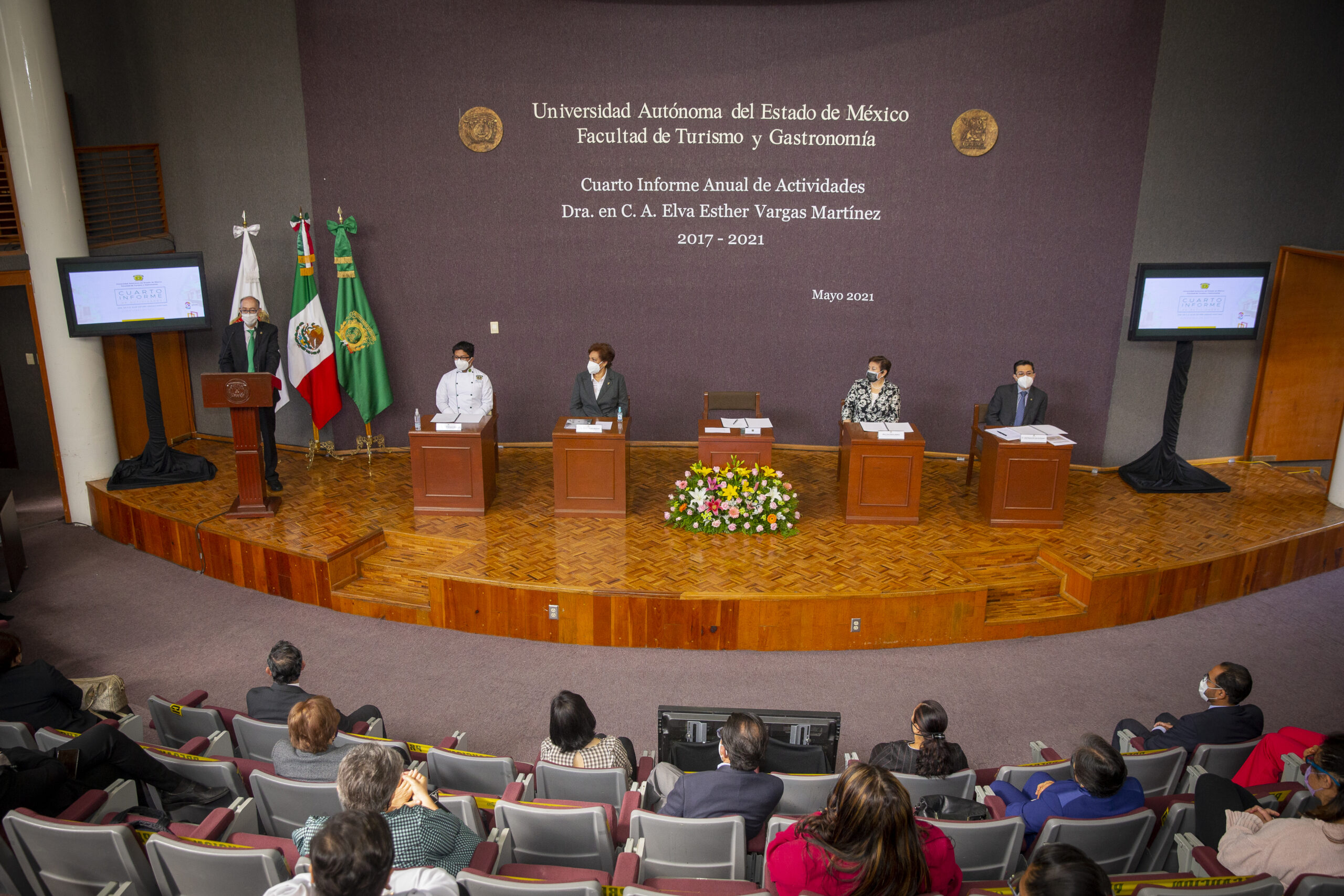 Al encabezar la lectura del cuarto informe de actividades de la directora de la Facultad de Turismo y Gastronomía, Elva Esther Vargas Martínez, el rector destacó que la máxima casa de estudios mexiquense ha adquirido nuevas capacidades y experiencia para asumir los desafíos que impone el vértigo de la transformación nacional y la colaboración mundial.