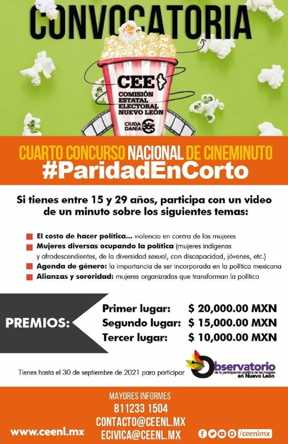 Para conocer la convocatoria es necesario ingresar al sitio web https://www.ceenl.mx/2021/cineminuto. Los resultados se darán a conocer el 1 de noviembre de 2021 en www.ceenl.mx y en las redes sociales del Observatorio de la Participación Política de las Mujeres en Nuevo León.