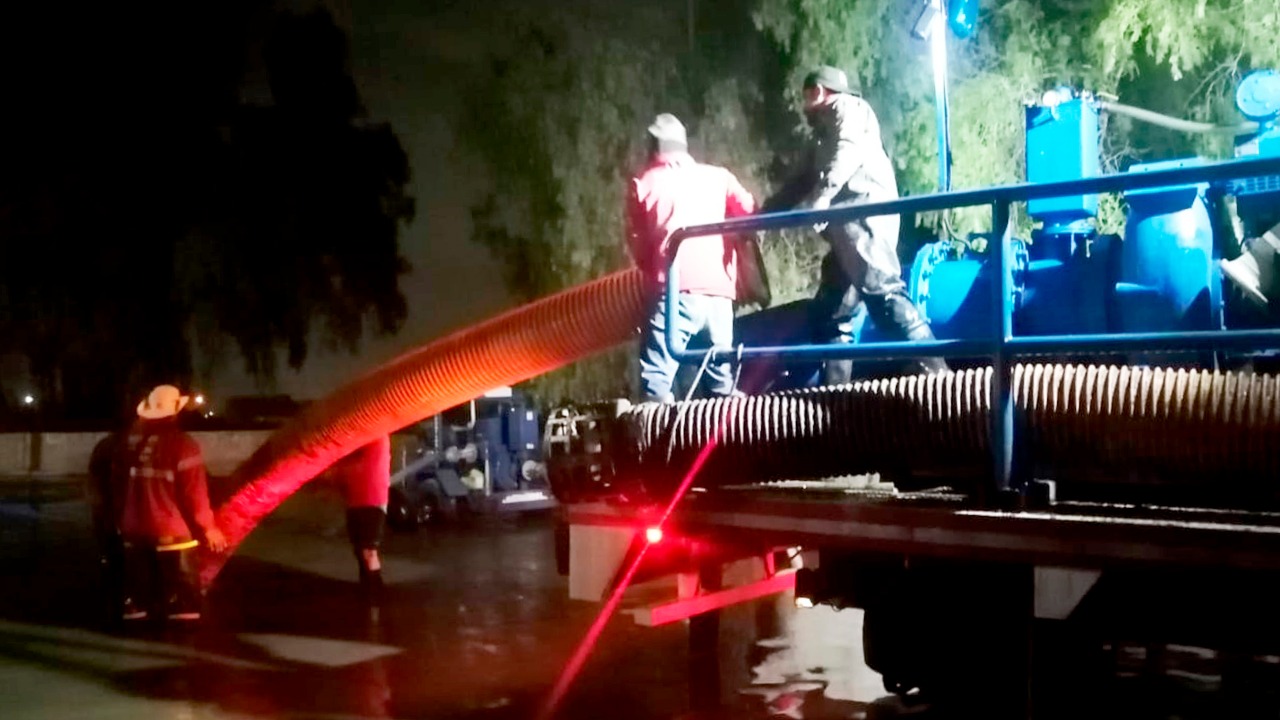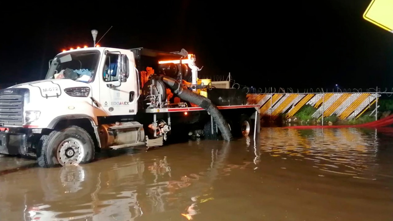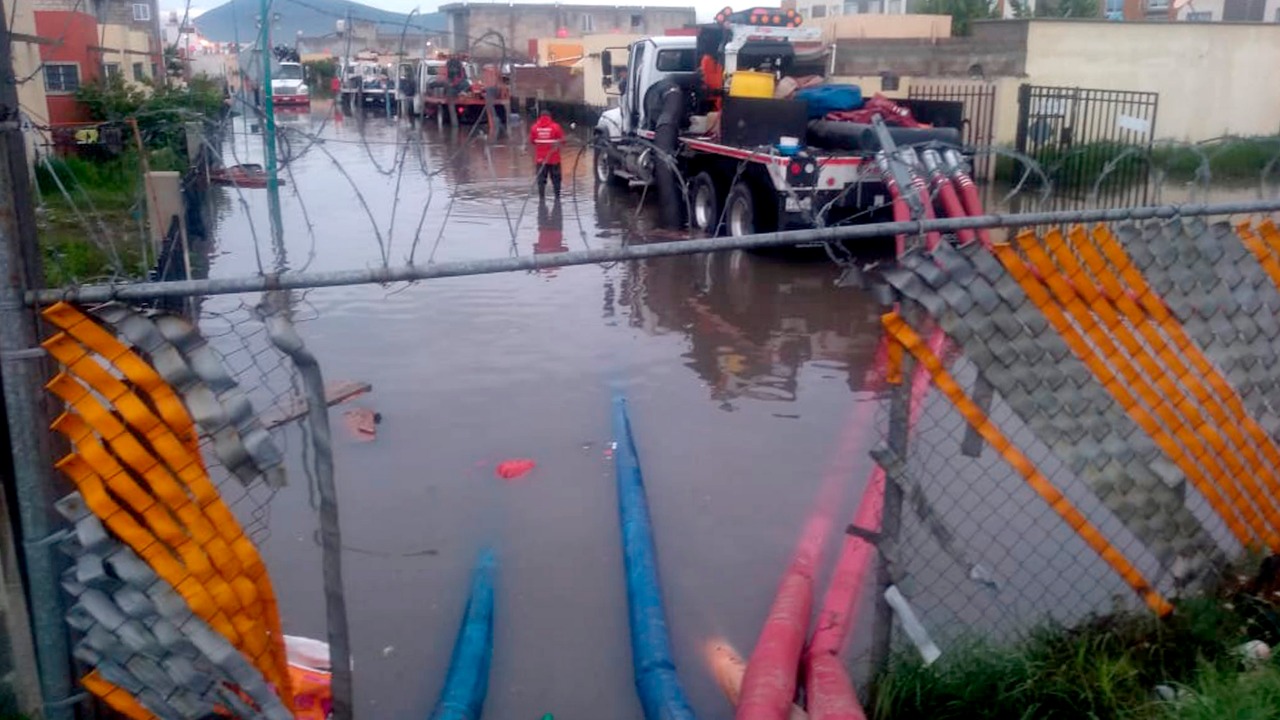 Desde la madrugada de este viernes, la CAEM mantiene en el municipio a 13 elementos del Grupo Tláloc desalojando las aguas pluviales y residuales, con siete equipos de gran capacidad de bombeo: cuatro camiones especializados y tres bombas Thompson.