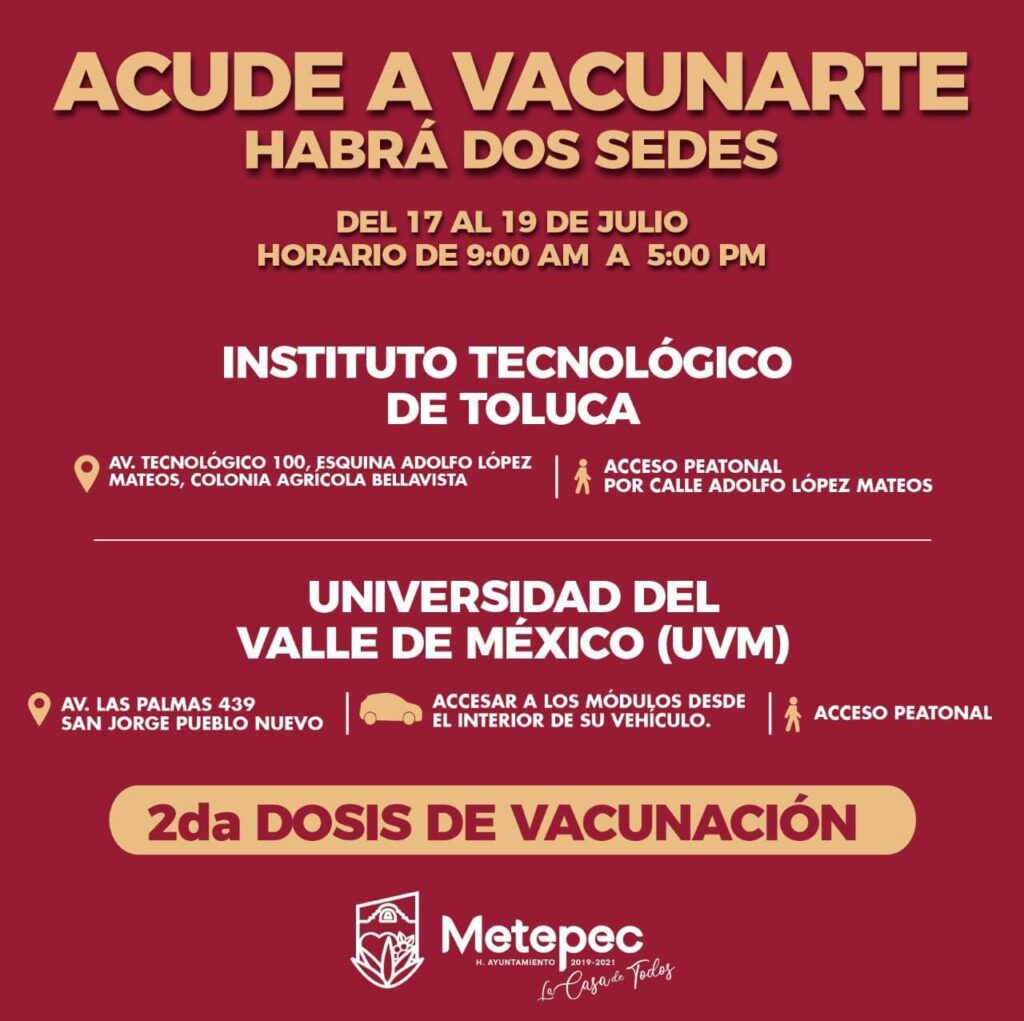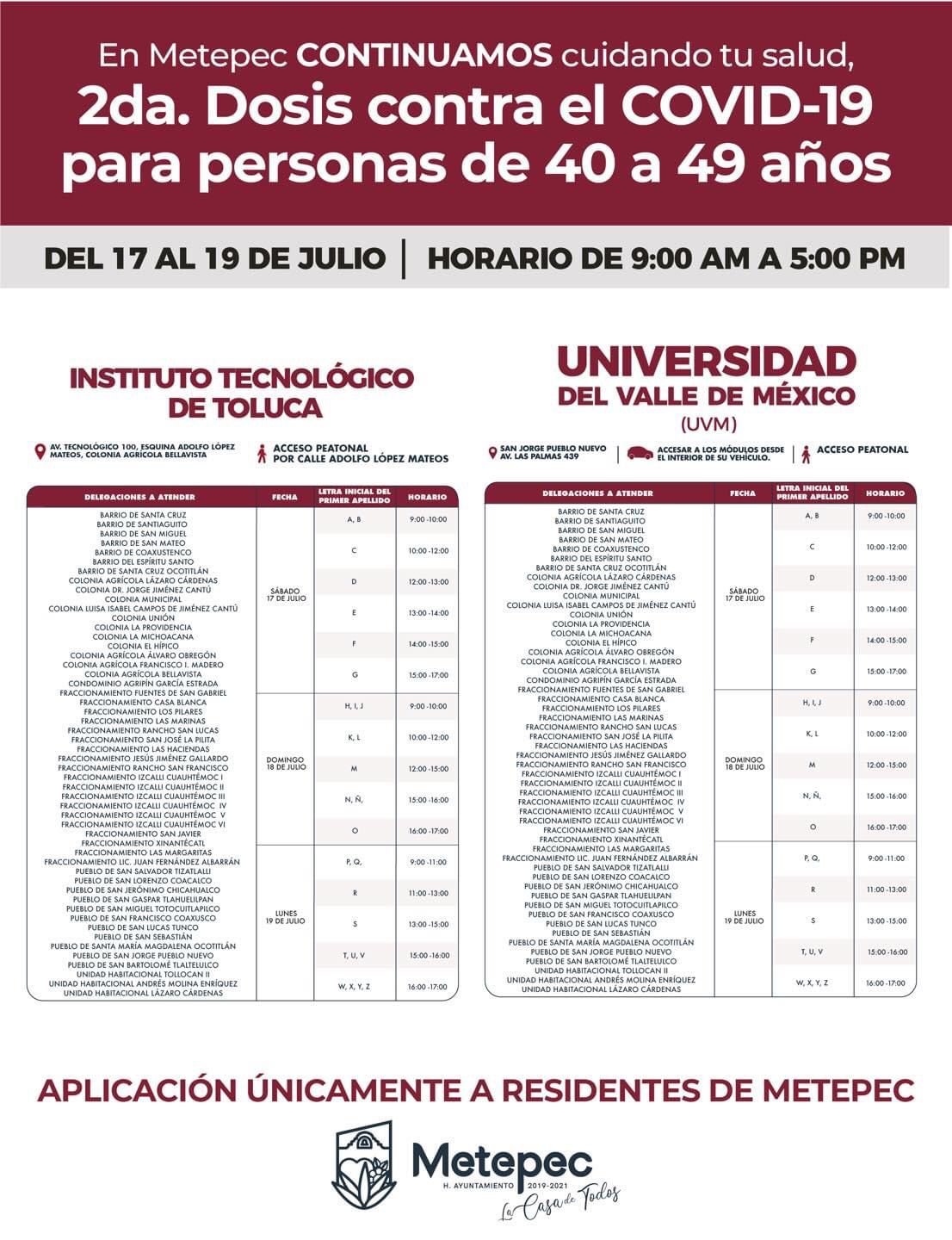 Metepec, México; 15 de julio de 2021.– El gobierno de Metepec se encuentra listo para la aplicación de la 2a dosis de la vacuna contra COVID-19, para personas de 40 a 49 años de edad, informó la alcaldesa Gaby Gamboa Sánchez, quien informó además, que la jornada de vacunación será a partir del sábado 17 al lunes 19 del presente mes de las 9:00 a las 17:00 horas en las sedes: el Instituto Tecnológico de México plantel Metepec, con domicilio en avenida Tecnológico, colonia Bellavista y en la Universidad del Valle de México (UVM), con dirección en la calle de Palmas en San Jorge Pueblo Nuevo.