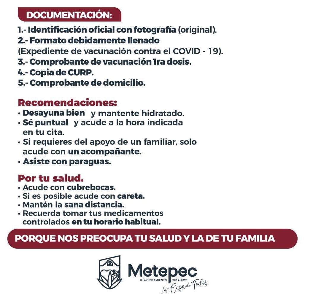 Los horarios en que los toluqueños podrán acudir a esta Jornada de Vacunación será de 9:00 a 17:00 horas y deberán presentar una identificación oficial con fotografía, CURP, comprobante de aplicación de la primera dosis y el formato de registro (impreso nuevamente).