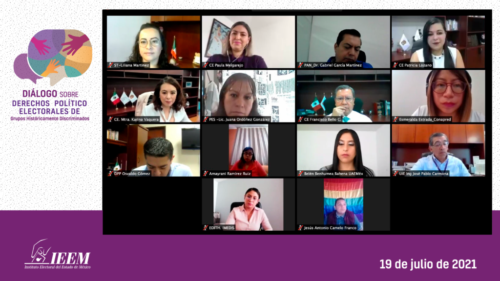 Toluca, México, a 19 de julio de 2021.- Con el objetivo de generar un diálogo para conocer los obstáculos, retos y propuestas para el ejercicio de los derechos político-electorales de personas que forman parte de grupos históricamente discriminados como pueden ser con discapacidad, afromexicanas y pertenecientes a la comunidad LGBTTTIQ, el Instituto Electoral del Estado de México (IEEM) llevó a cabo el “Diálogo sobre derechos político electorales de grupos históricamente discriminados”.