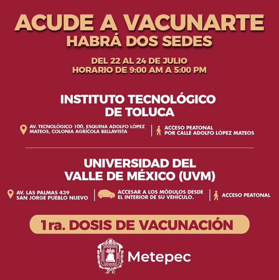 Metepec, México, 20 de julio de 2021.- En Metepec siguen las accioness en el tema de combate al COVID-19, ya que a partir del jueves 22 al sábado 24 de este mes, se aplicará la primera dosis de la vacuna para las personas de 30 a 39 años de edad.