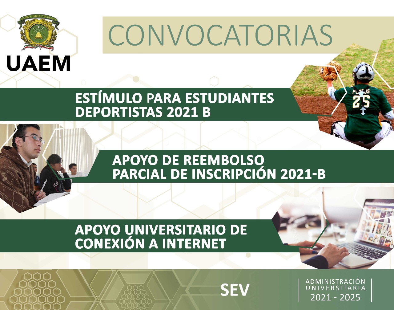 - Entre las convocatorias disponibles están aquellas para el Apoyo Universitario de Conexión a Internet, Apoyo de Reembolso Parcial de Inscripción 2021-B y Estímulo para Estudiantes Deportistas 2021.