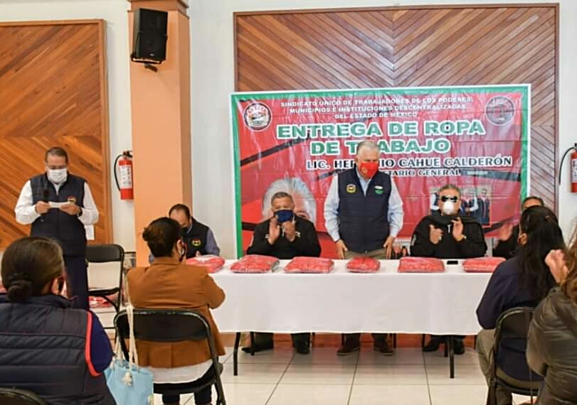 Toluca, Estado de México, 8 de septiembre de 2021. Herminio Cahue Calderón, Secretario General del Sindicato Único de Trabajadores de los Poderes, Municipios e Instituciones Descentralizadas del Estado de México (SUTEYM), encabezó la entrega de ropa deportiva a delegaciones del sector central, la cual se realizó en el marco de la aplicación de las medidas preventivas y protocolos sanitarios vigentes.