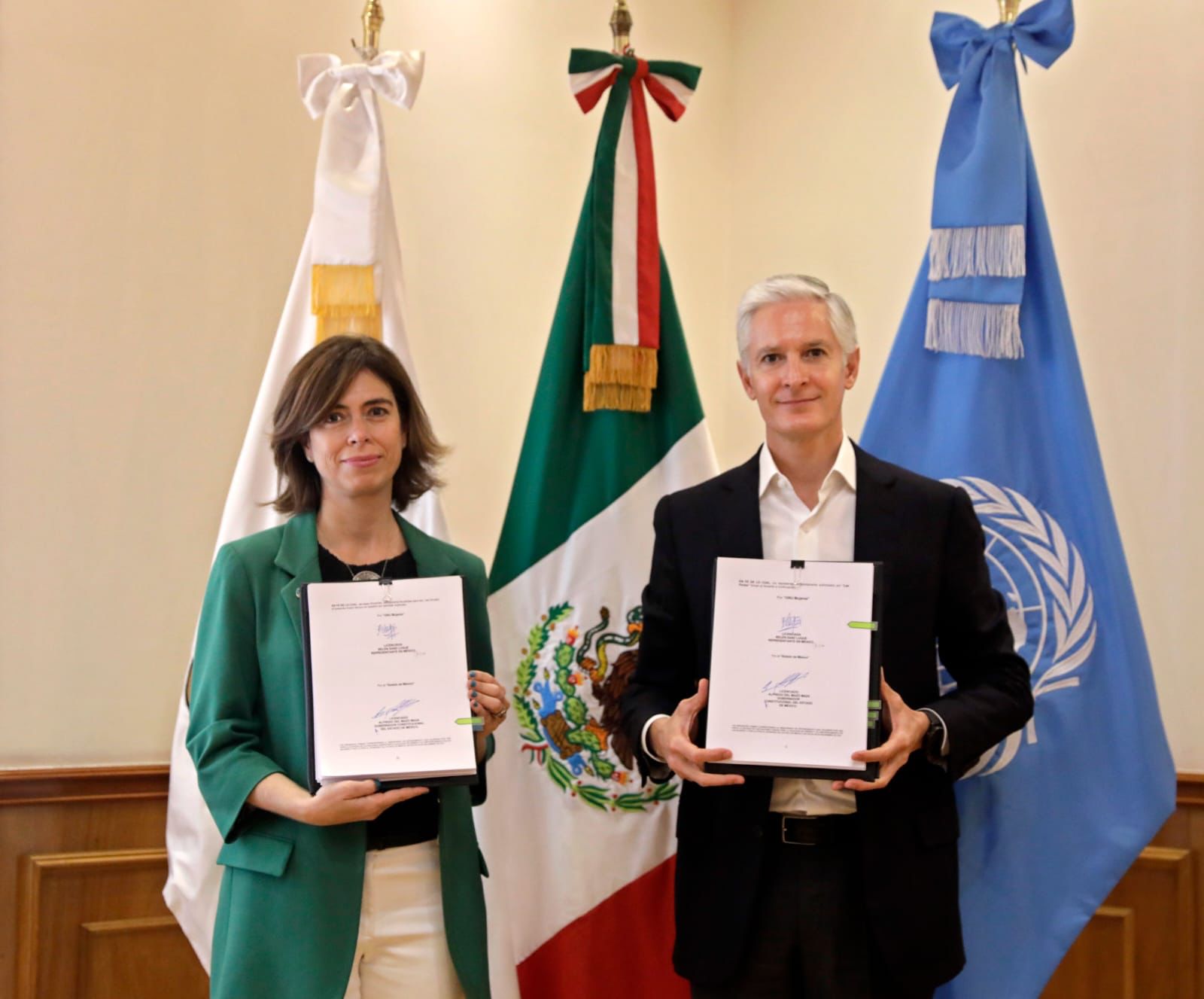 En esta reunión, realizada en el Salón Adolfo López Mateos de la sede del Poder Ejecutivo estatal, estuvieron presentes además Ana Cristina Santellanes Ruiz, Coordinadora del Programa Segunda Oportunidad de ONU Mujeres, así como los titulares de la Secretarías de la Mujer, Desarrollo Económico y Educación de la entidad mexiquense.