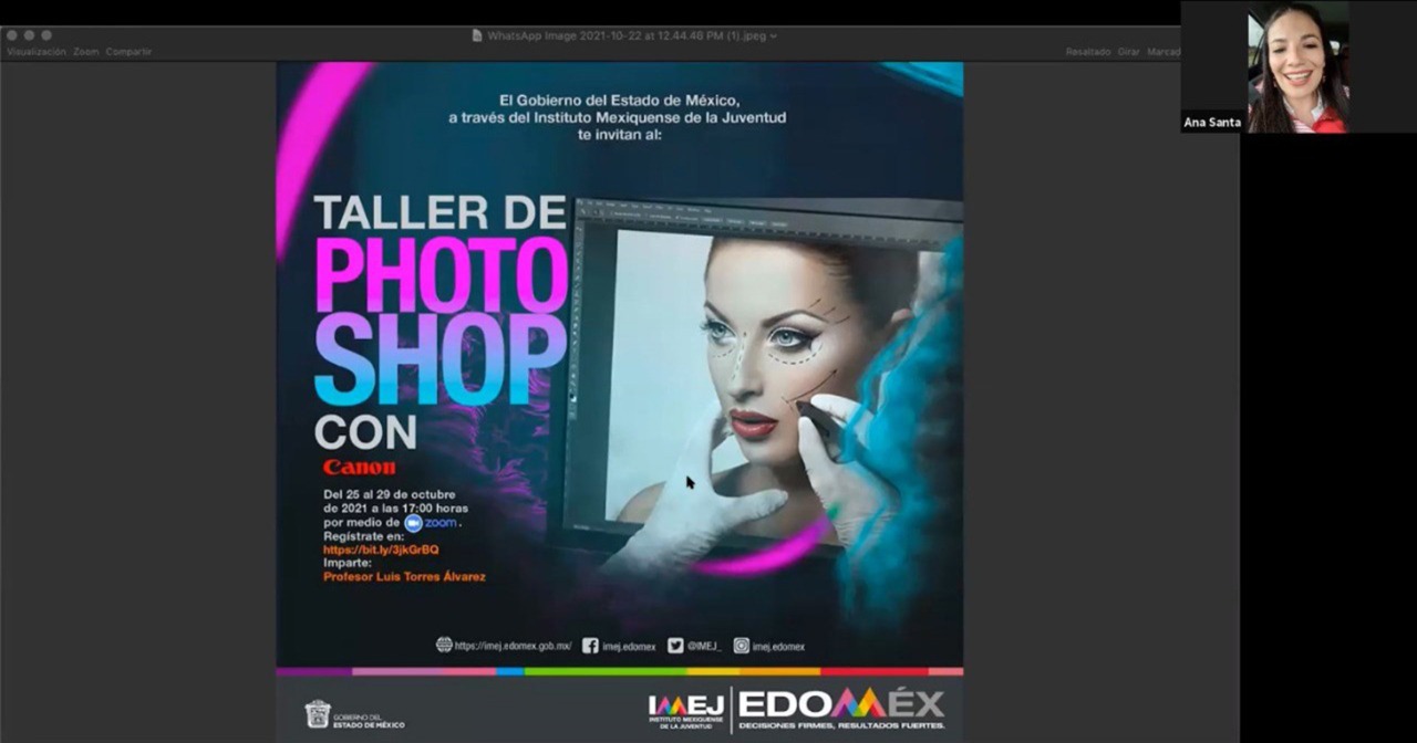Toluca, Estado de México, 11 de noviembre de 2021. Con la finalidad de conocer algunos procesos para mejorar fotografías digitales, mediante el uso del software más popular de retoque fotográfico, el Instituto Mexiquense de la Juventud (IMEJ), organismo sectorizado a la Secretaría de Desarrollo Social, en coordinación con Canon Academy, realizó un taller de Photoshop, dirigido a las y los jóvenes mexiquenses de 12 a 29 años.