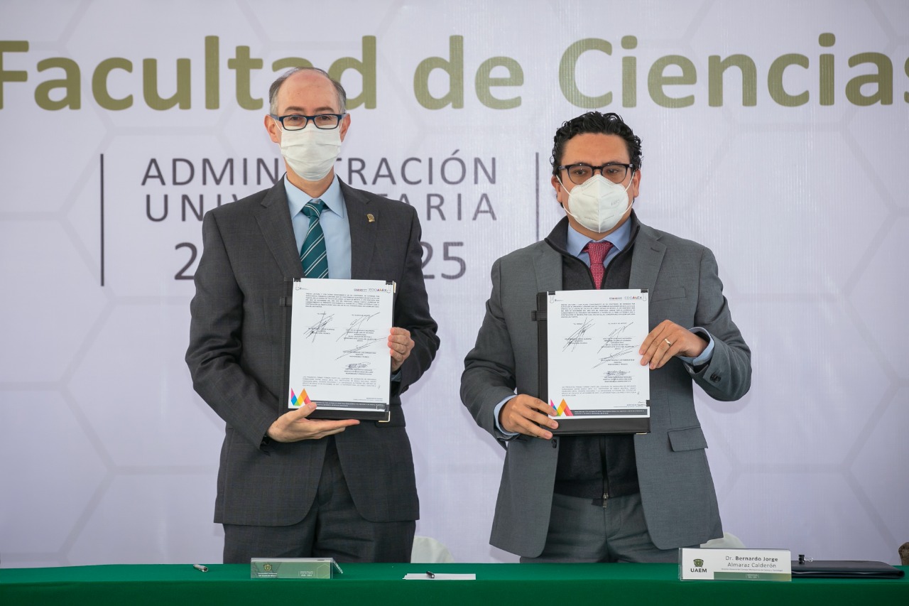 En el marco de la ceremonia conmemorativa al 35 aniversario de la Facultad de Ciencias, el rector y el director general del Consejo Mexiquense de Ciencia y Tecnología (COMECyT), Bernardo Jorge Almaraz Calderón, signaron un convenio de colaboración para poner en marcha el Centro de Innovación Digital, que permitiría atender necesidades de procesamiento y análisis de información digital y convertirse en un semillero de recursos humanos altamente calificados en tecnologías de la información y la comunicación.
