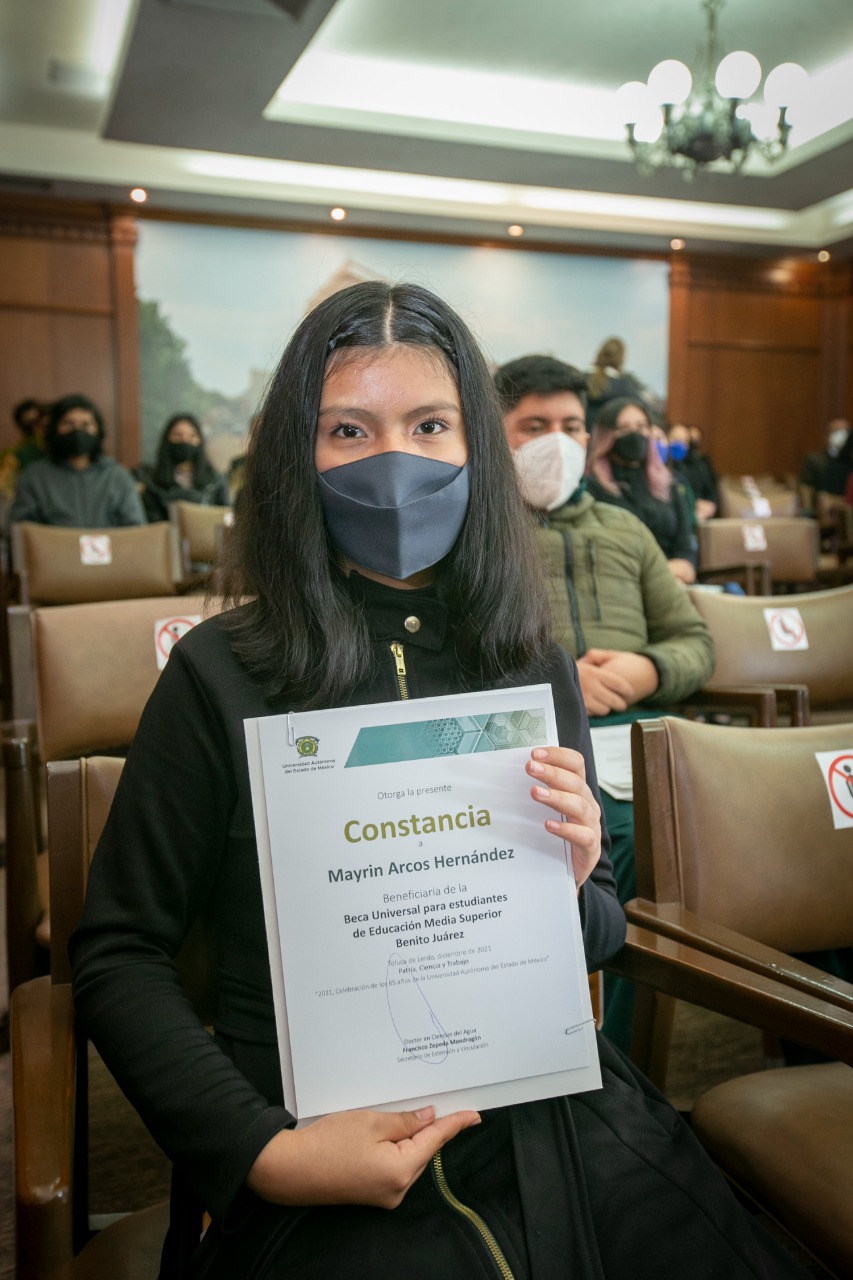 Ana Paola Olmos Mendiola, alumna del Plantel “Nezahualcóyotl” de la Escuela Preparatoria de la UAEM, en representación de la comunidad beneficiada, indicó que gracias a la Beca “Benito Juárez” ningún joven se queda sin estudiar por motivos económicos. “Nos queda enfocarnos en nuestros estudios y vivir la mejor etapa de nuestras vidas”.