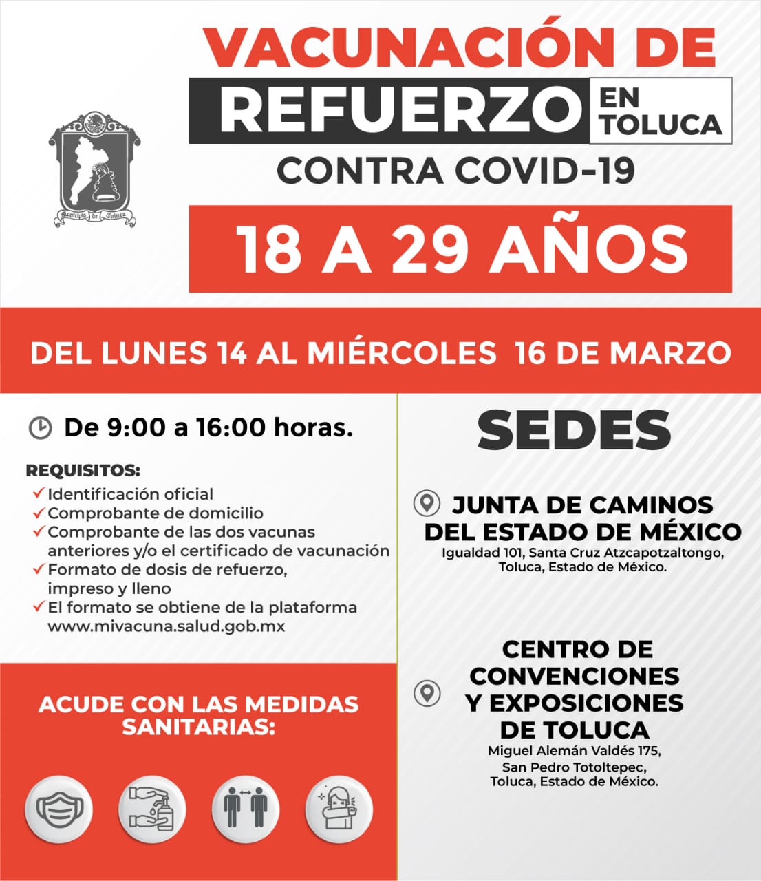 Toluca, Estado de México, 13 marzo de 2022.- El gobierno municipal de Toluca recuerda a la población de 18 a 29 años de edad que la aplicación de la dosis de refuerzo contra el SARS-CoV-2 continúa del lunes 14 al miércoles 16 de marzo en únicamente dos sedes.
