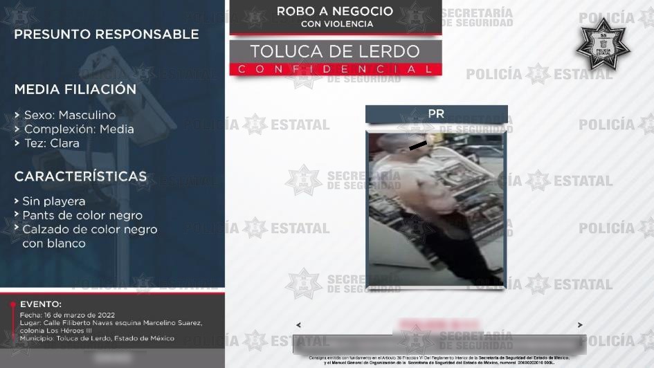 Toluca, Estado de México, 18 de marzo de 2022.- En atención a una consigna operativa, policías de la Secretaría de Seguridad (SS) detuvieron a un hombre probablemente implicado en el delito de robo con violencia a una tienda de conveniencia; en la acción, recuperaron la mercancía sustraída del establecimiento momentos antes.