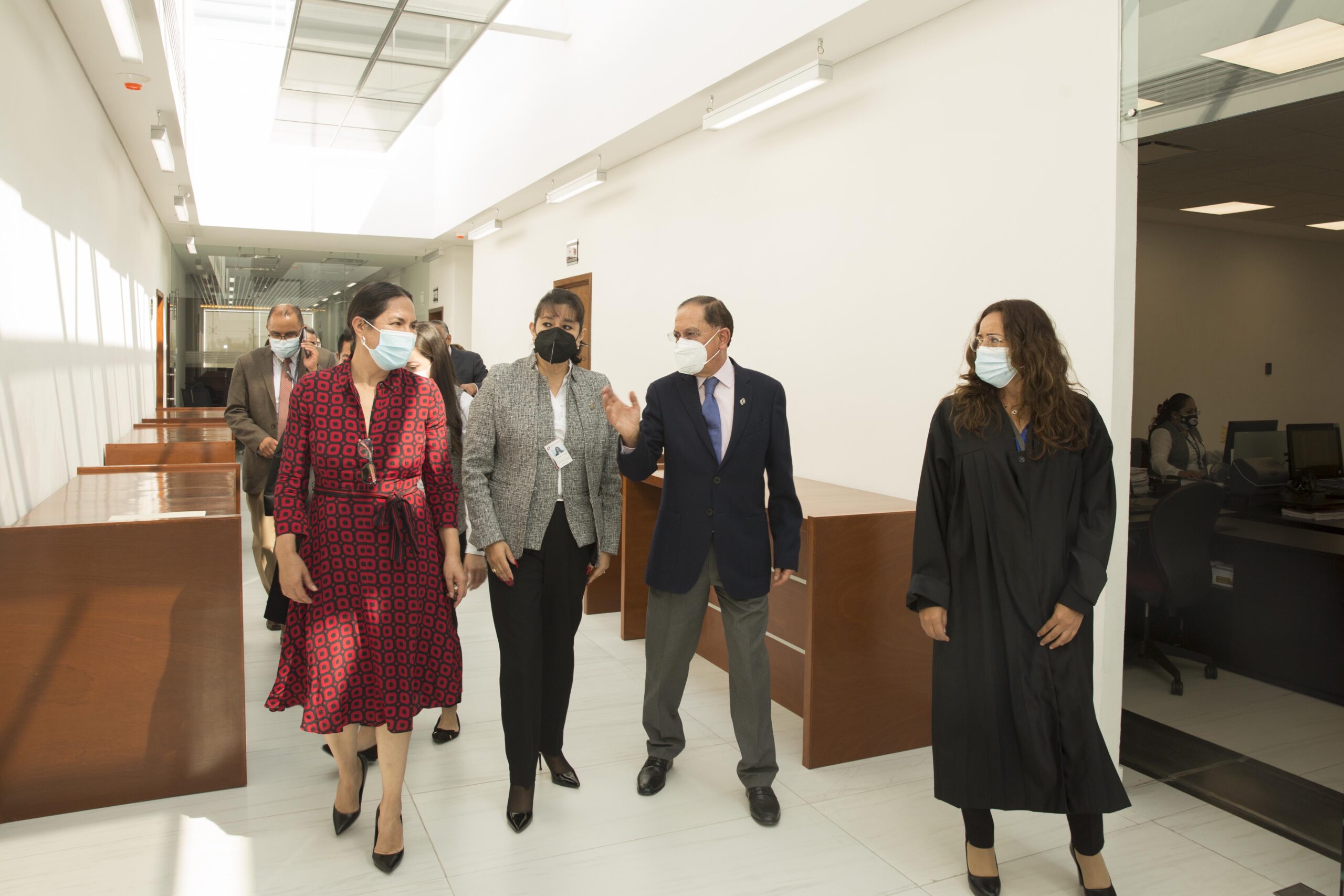 Vega Gómez realizó un recorrido por las instalaciones, acompañado de la y los magistrados Julia Hernández García, José Noé Gómora Colín y Marco Antonio Díaz Rodríguez, Presidenta e integrantes de la Primera Sala Colegiada de Ecatepec. Así como, Lucía Herrera Mérida, Manuel Velázquez Quintero, David Velázquez Vargas, jueces de Primera instancia y Luz María Martínez Colín, Secretaria de Acuerdos de Sala, en funciones de administradora, del Juzgado Primero Civil y de Extinción de Dominio.