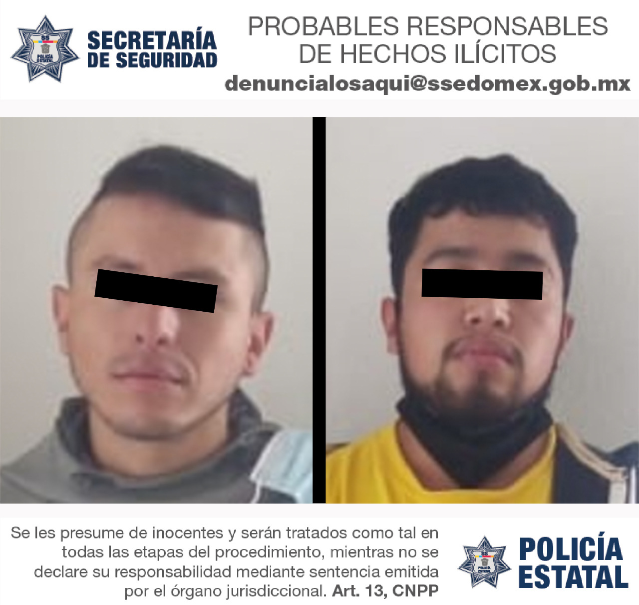 Metepec, Estado de México, 17 de julio de 2022. Al desarrollar despliegues operativos, elementos de la Secretaría de Seguridad (SS) en coordinación con efectivos de la Policía Municipal, detuvieron a dos probables implicados en los delitos de extorsión y contra la salud; en la acción, aseguraron dos envoltorios con posible droga conocida como cristal. Las fuerzas del orden efectuaban recorridos de seguridad y vigilancia, con la finalidad de inhibir actos delictivos, cuando al circular sobre la calle Prolongación Atizapán, esquina con vía Parque Foresta, en la colonia San Miguel Totocuitlapilco, observaron que un hombre de aproximadamente 41 años, mediante señalamientos solicitaba auxilio. De forma inmediata, los policías de la SS hicieron contacto con el ciudadano, quien denunció que dos hombres le han realizado varias llamadas telefónicas en repetidas ocasiones, solicitándole dinero, para que lo dejen trabajar en su taller de herrería, añadió que el guardia de seguridad del fraccionamiento donde vive, le dijo que momentos antes, los sujetos dejaron en el buzón de su domicilio media fotografía en la que aparece con sus dos hijas.