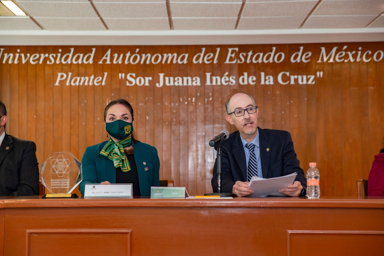 Antes, en la explanada del plantel universitario, el rector Carlos Eduardo Barrera Díaz entregó a la presidenta municipal de Amecameca, Ivette Topete García el reconocimiento al Fortalecimiento Universitario “Luis Mario Schneider” por la construcción de un arcotecho en la cancha de básquetbol que beneficia a una comunidad de 2 mil 176 integrantes, de los cuales mil 253 son mujeres y 923 hombres.