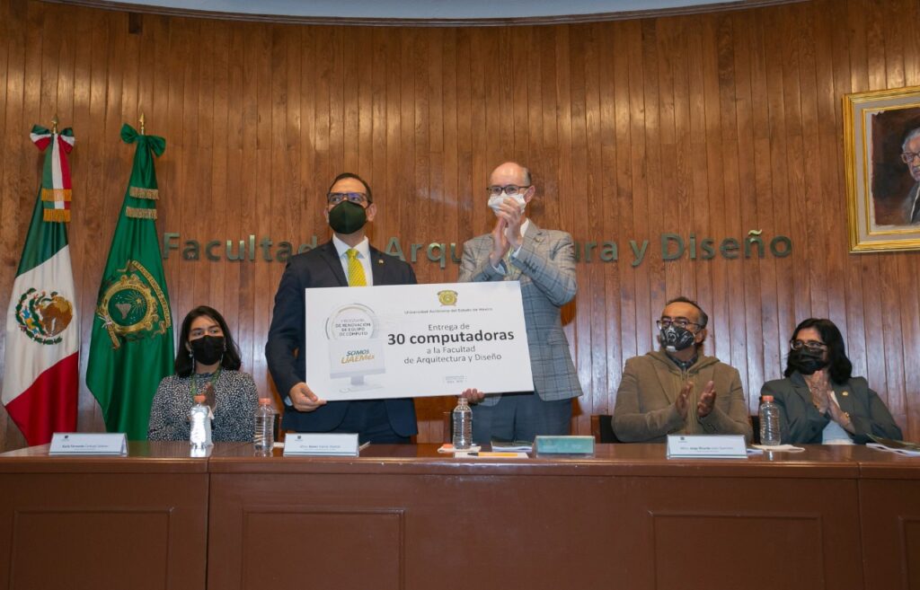 Por separado, el rector, en compañía de la secretaria de Administración de la UAEMéx, Eréndira Fierro Moreno, acudió a la Facultad de Artes para hacer entrega de 30 computadoras específicas para él área de conocimiento de los estudiantes de este espacio académico como parte del Programa de Renovación de Equipo de Cómputo.