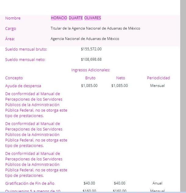 Más aún, desde sus cargos federales nunca se bajaron el sueldo y tuvieron percepciones salariales libres de polvo y pajaal mes de 108 mil 698 pesos como fue el caso de Horacio Duarte Olivares al frente de la Agencia Nacional de Aduanas de México o los 115 mil 037 pesos que ganaba Delfina Gómez Álvarez siendo titular de la Secretaría de Educación Pública.