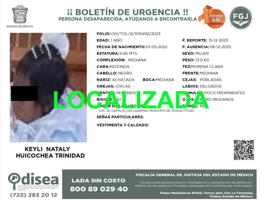 • Keyli Nataly Huicochea Trinidad de un año de edad,