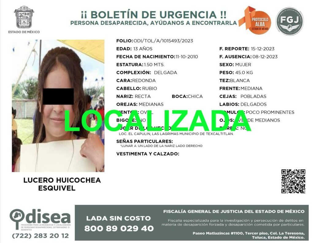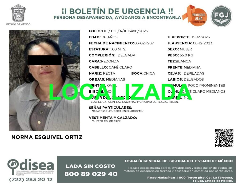 La Fiscalía del Estado de México informa que ayer 16 de enero, servidores públicos de esta Institución recibieron una llamada anónima en la que se refirió que una de las personas que había sido boletinada como desaparecida, de nombre Norma Esquivel Ortiz y otros individuos también reportados desaparecidos, se encontraban en las inmediaciones de una capilla ubicada en la comunidad de Raíces perteneciente al municipio de Zinacantepec, motivo por el cual se organizó una acción operativa en conjunto con la SEDENA y que contó con la colaboración de la policía municipal de Zinacantepec para verificar dicha información, ello con resultados positivos.