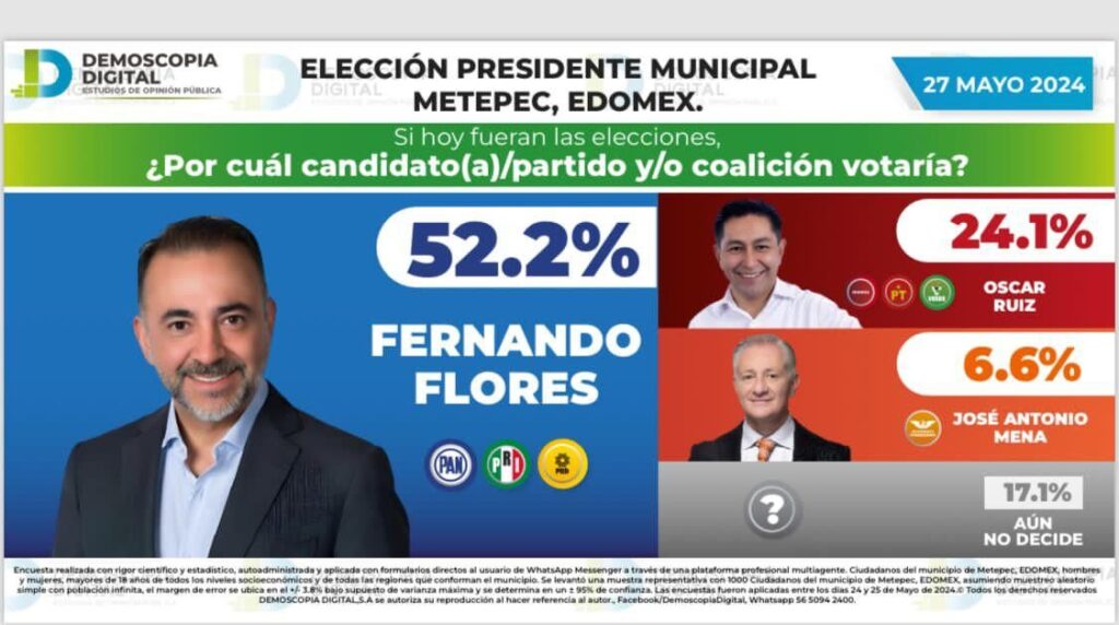 Metepec, México, 27 de mayo de 2024. Luego de una exitosa campaña como candidato de la Coalición PAN-PRI-PRD-NUEVA ALIANZA, el alcalde con licencia y candidato a un nuevo período consecutivo como presidente municipal, Fernando Flores Fernández ha obtenido un pronóstico muy favorable sobre los otros aspirantes que compitieron por los partidos de oposición, de forma que sólo se espera que las cifras se confirmen con la votación ciudadana del domingo próximo.