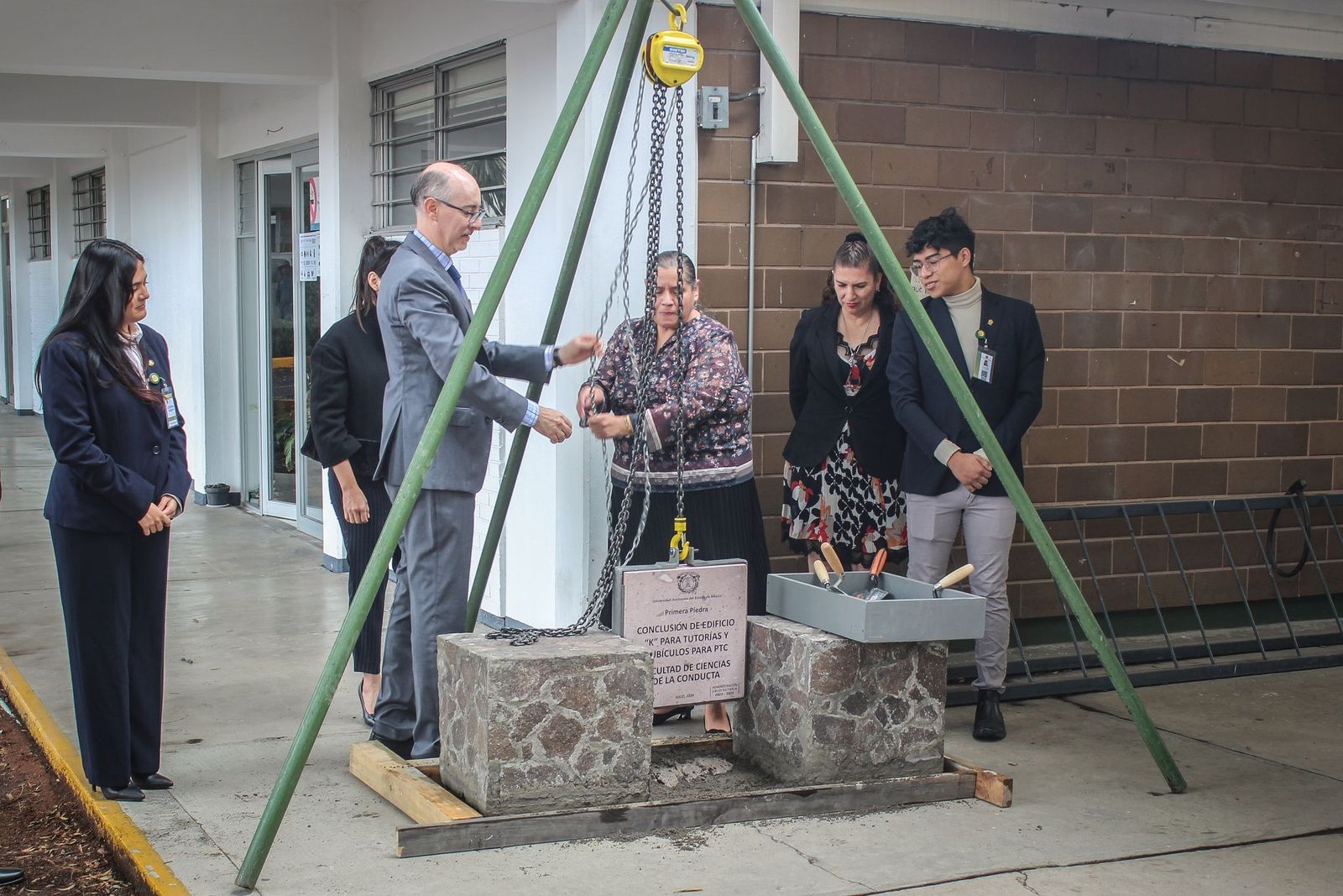 Previo al informe, el rector de la UAEMéx colocó la primera piedra de tres aulas de tutorías, 12 cubículos para el profesorado de tiempo completo, una sala de lectura, un site de datos y un módulo de escaleras.