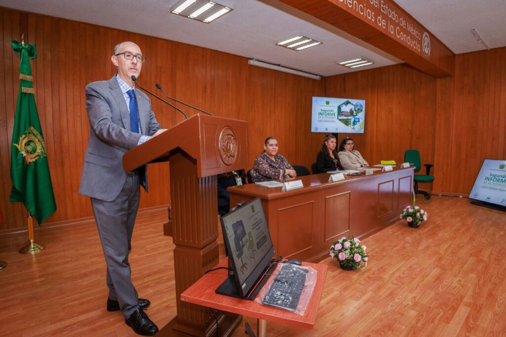 Toluca, México, 11 de julio de 2024. La Facultad de Ciencias de la Conducta de la Universidad Autónoma del Estado de México (UAEMéx) forma profesionistas e investigadores dedicados a promover el desarrollo humano, la salud mental y emocional de las personas, además del desarrollo social y comunitario, al igual que la pedagogía, la didáctica y el bienestar físico y motor de los seres humanos, destacó el rector Carlos Eduardo Barrera Díaz, al encabezar el segundo informe de actividades de la directora de este organismo académico, Gabriela Hernández Vergara.
