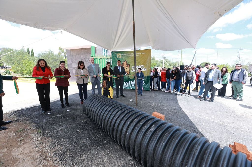 *Teotihuacan, México, 13 de agosto de 2024.* En beneficio de la comunidad del Centro Universitario Valle de Teotihuacan de la Universidad Autónoma del Estado de México (UAEMéx), el rector Carlos Eduardo Barrera Díaz, y la presidenta municipal de Axapusco, Miriam Coronel Meneses, entregaron una línea de drenaje de 250 metros, así como la techumbre para 17 automóviles de Profesores de Tiempo Completo en el estacionamiento de este campus.