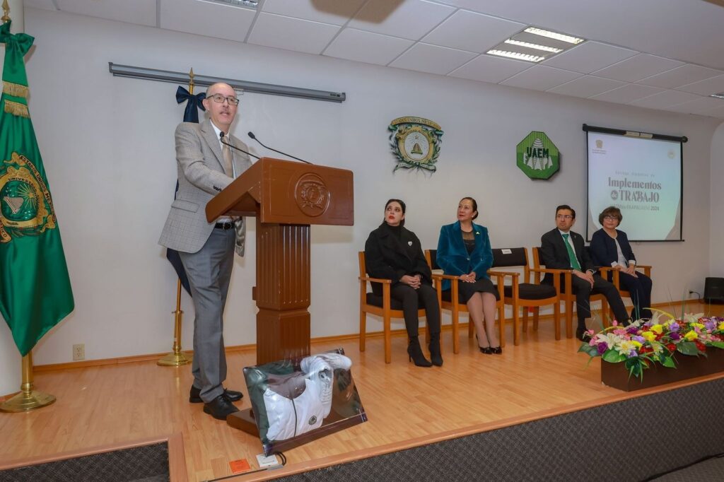 • El rector de la UAEMéx, Carlos Eduardo Barrera Díaz, encabezó la ceremonia de entrega simbólica de implementos de trabajo a la FAAPAUAEM 2024.