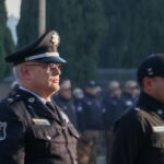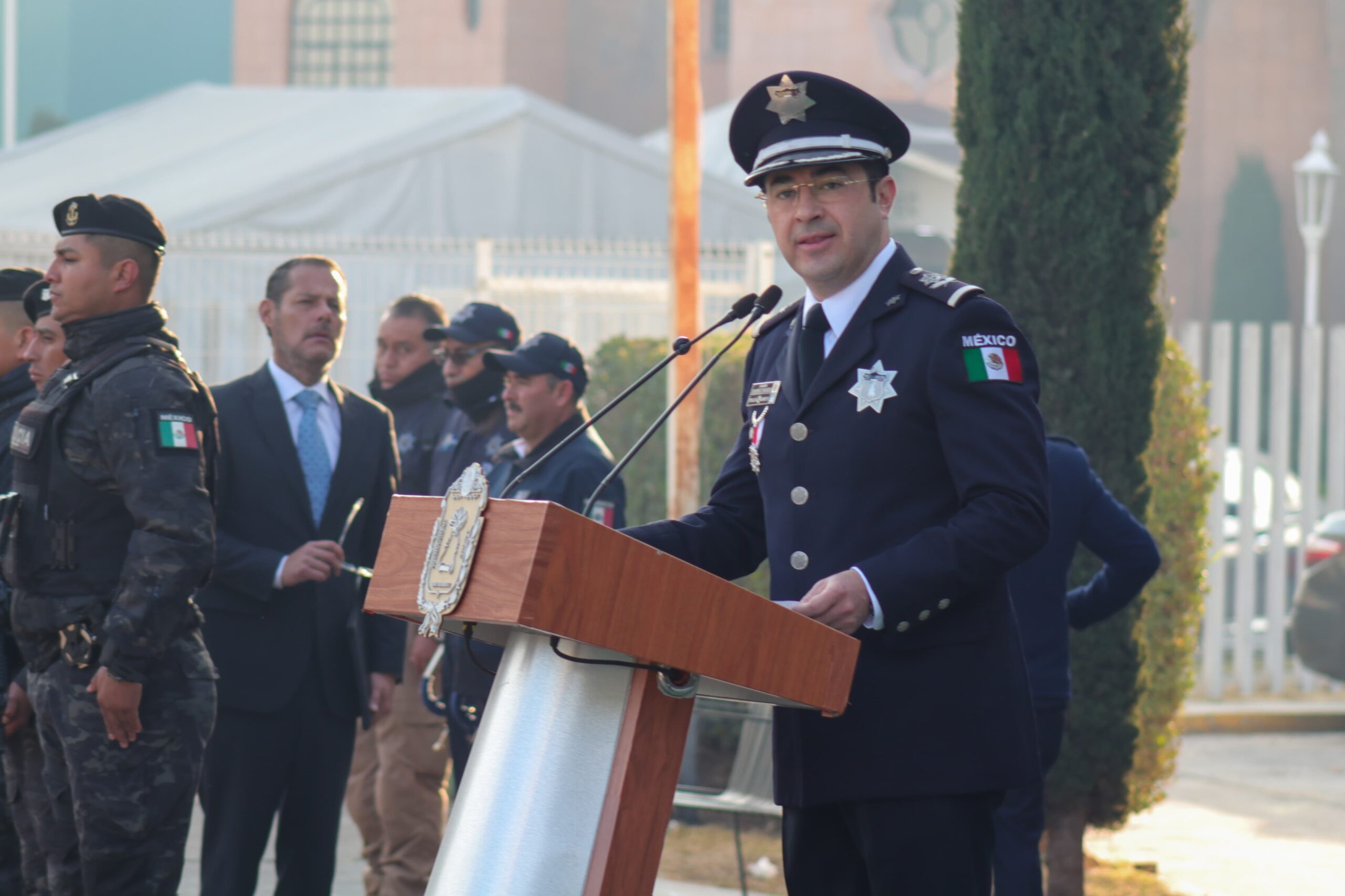 * Pase de revista a elementos de la Dirección de Seguridad Pública Municipal en la explanada de la Corporación.