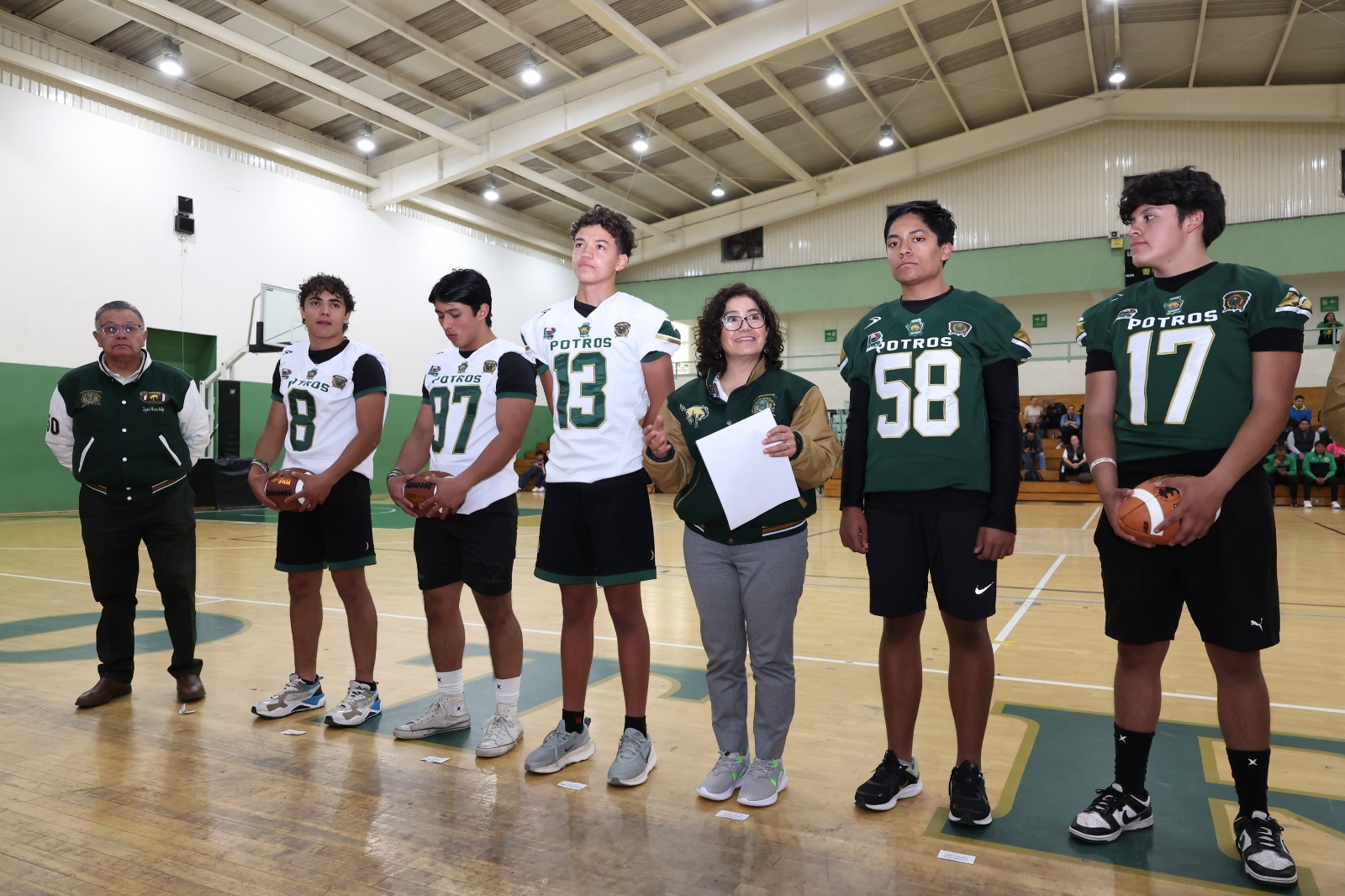 Acompañada por el secretario de Gobernanza Universitaria, Jorge Alejandro Vásquez Caicedo; el director de Cultura Física y Deporte, Luis Antonio Zimbrón Romero, y el presidente del Patronato de Potros Salvajes, Eugenio Herrera Vallejo, Zarza Delgado hizo entrega simbólica de los jerseys a Daniel Urbina López, Leonardo Obed Sánchez López, Diego Toledo Miranda, Ricardo Coraguez Mondragón y Alberto Mora Delgado, capitanes de los equipos oro y verde de la Categoría Juvenil, en representación de los 150 jugadores de fútbol americano.