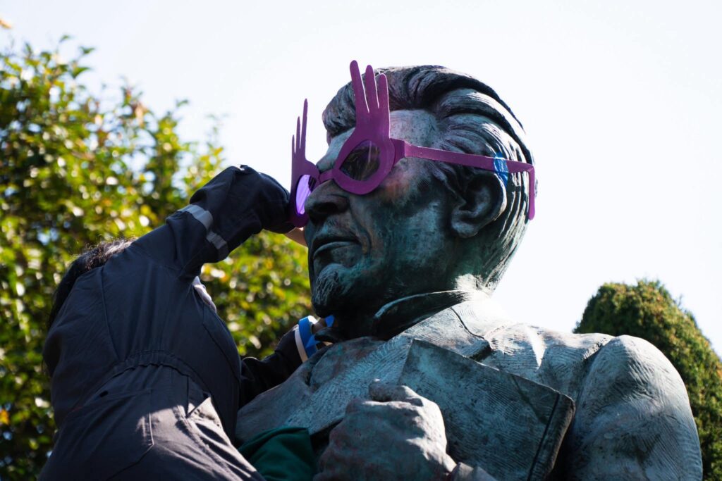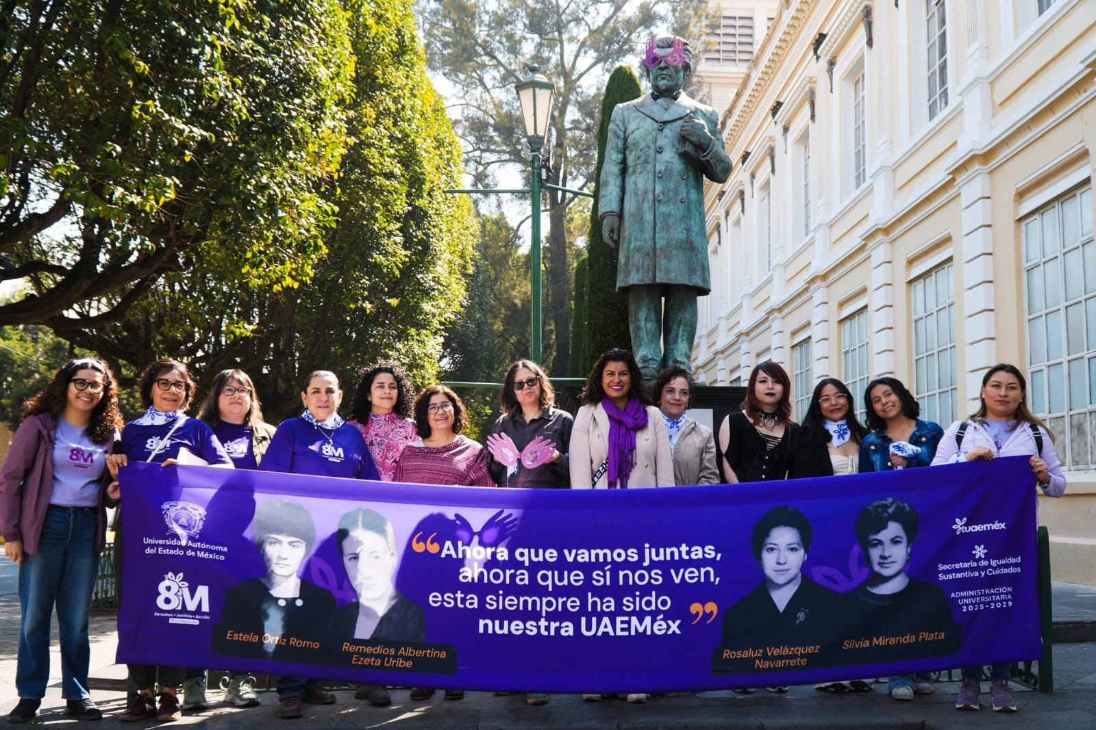 Entre las iniciativas destacó “Perspectiva Violeta”, una intervención en la que estuvo presente la rectora Martha Patricia Zarza Delgado y realizada por alumnas de la Facultad de Arquitectura y Diseño, quienes colocaron gafas violetas a las esculturas de Benito Juárez, Ignacio Ramírez Calzada e Ignacio Manuel Altamirano Basilio, ubicadas en el Edificio de Rectoría.