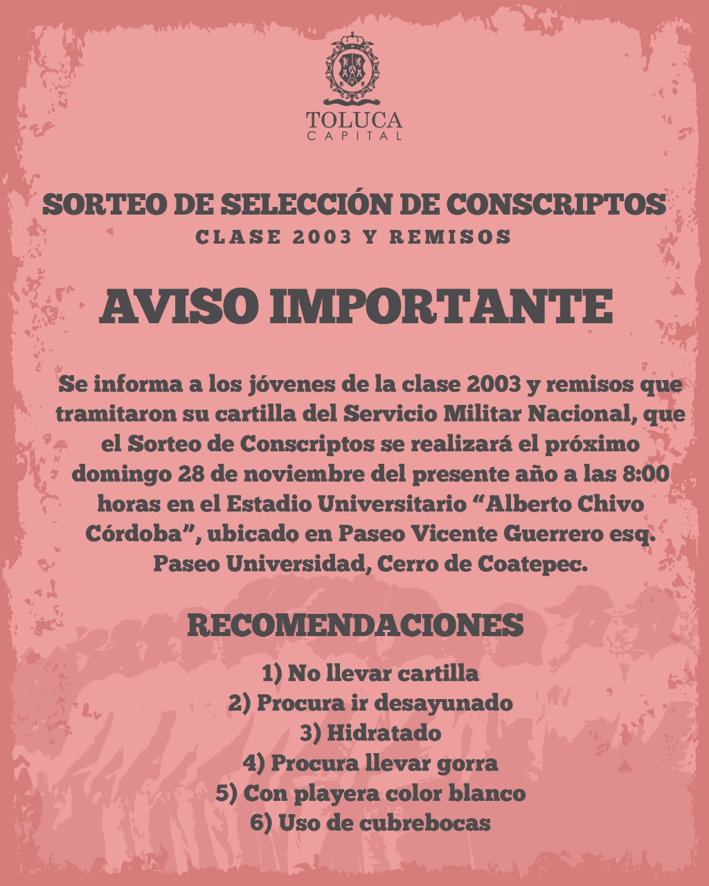 CONVOCA TOLUCA AL SORTEO DE CONSCRIPTOS CLASE 2003 Y REMISOS
